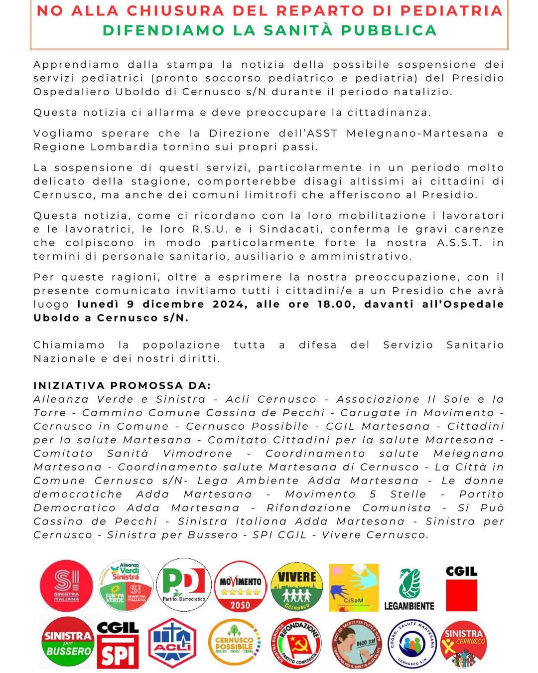 Erano i tempi della chiusura della Ginecologia e del Punto Nascite dell’Uboldo, quando una marea di persone si ritrovò a sfilare per le strade per chiedere di tornare indietro sulla decisione assunta all’epoca dall’Asst Melegnano Martesana (nella foto di copertina). Oggi, lunedì 9 dicembre 2024, in maniera molto più ridotta, ma si tornerà di nuovo in presidio. L’appuntamento è alle 18 proprio di fronte all’ingresso del presidio ospedaliero. A organizzarlo diverse sigle, politiche e non solo, che chiedono di tornare indietro sulla scelta di sospendere l’attività della Pediatria di Cernusco (dirottandola su Melzo) per il periodo natalizio.