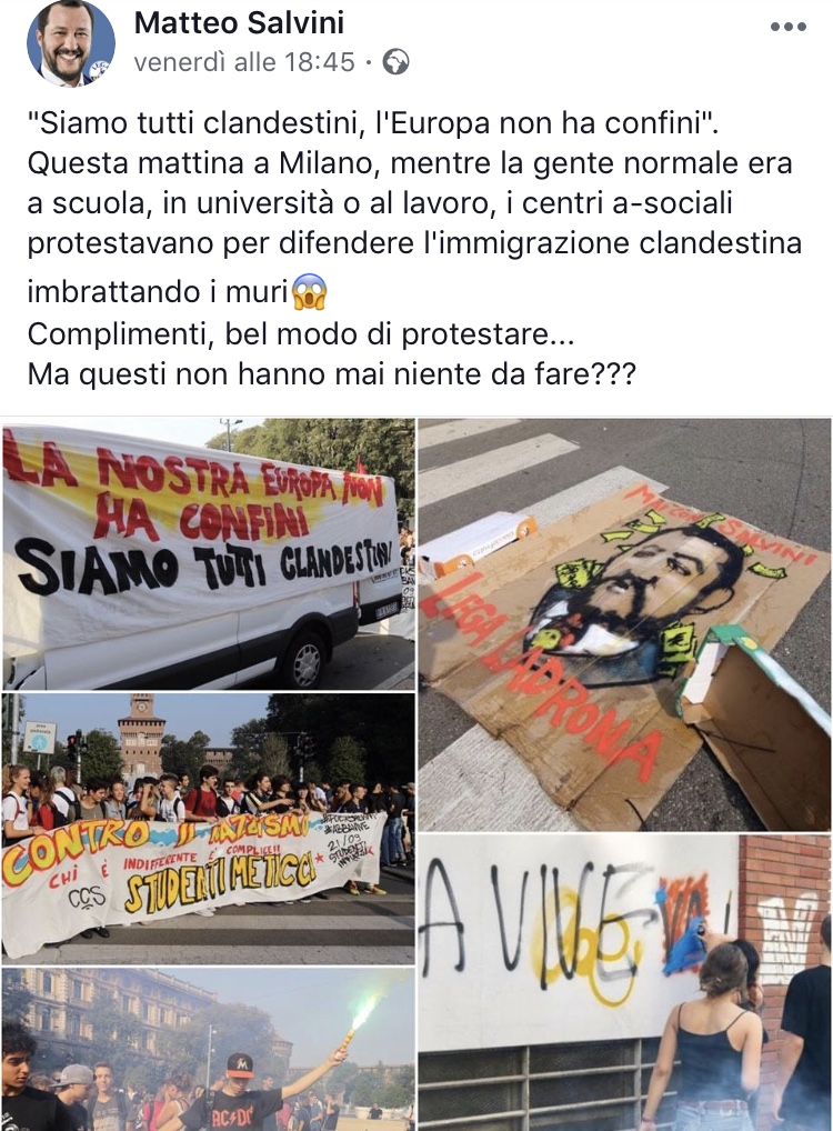 Durante il corteo non sono mancati attacchi e sfottò alla “Lega ladrona” e al ministro Matteo Salvini. Non si è fatta attendere la replica di quest’ultimo. “”Siamo tutti clandestini, l’Europa non ha confini” – ha scritto in un post venerdì sera -. Questa mattina a Milano, mentre la gente normale era a scuola, in università o al lavoro, i centri a-sociali protestavano per difendere l’immigrazione clandestina imbrattando i muri. Complimenti, bel modo di protestare… Ma questi non hanno mai niente da fare???”