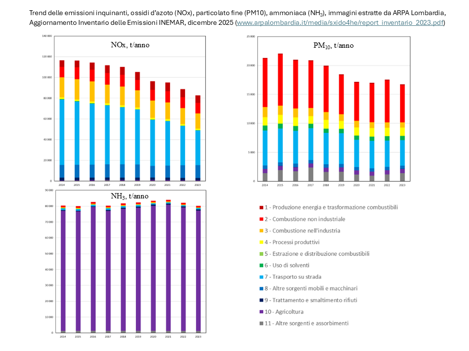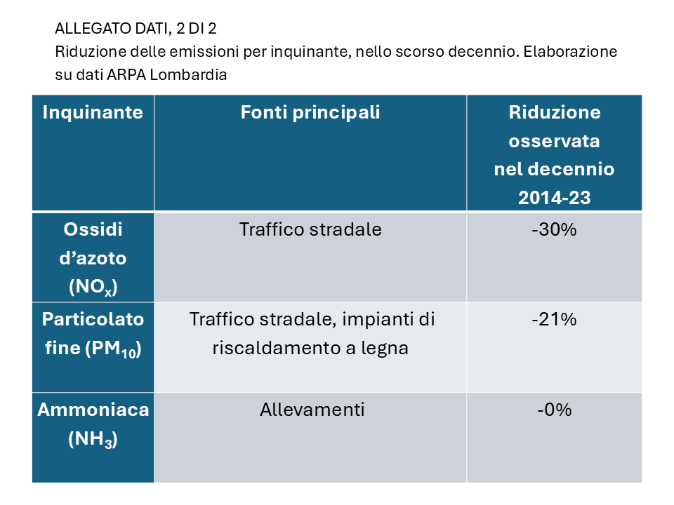 Guardando alla tendenza delle emissioni, il recente rapporto pubblicato da Arpa Lombardia è molto chiaro: nell’ultimo decennio il miglioramento delle motorizzazioni ha permesso un taglio del 30% delle emissioni di Nox (biossido di azoto), che sono anche precursori della formazione di polveri. Per quanto riguarda le emissioni di polveri primarie il miglioramento è stato meno consistente (-21%), considerato anche il ruolo importante che svolgono, come fonte emissiva, gli impianti di riscaldamento a legno e a biomassa legnosa.