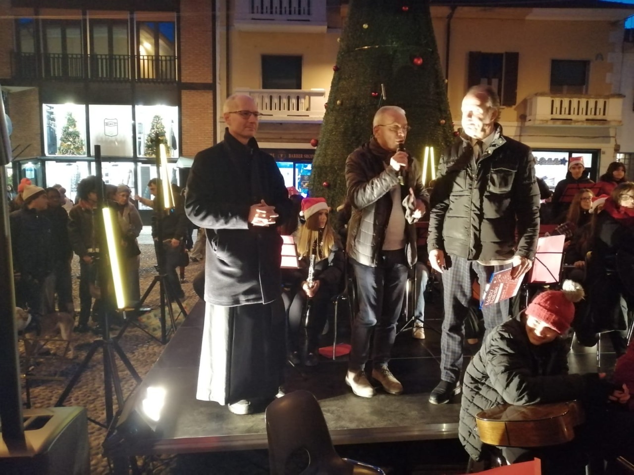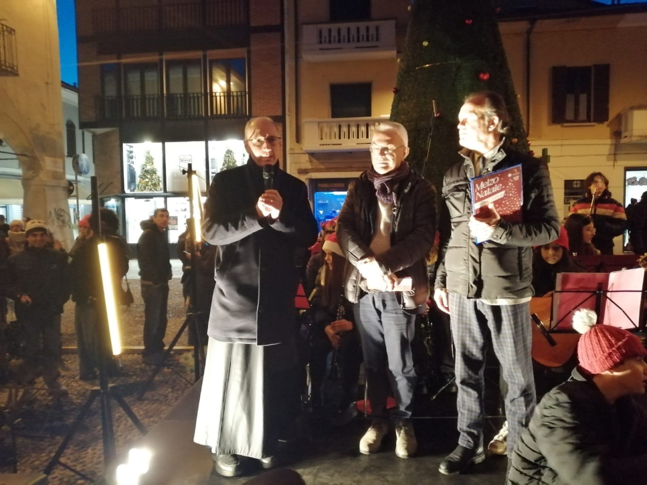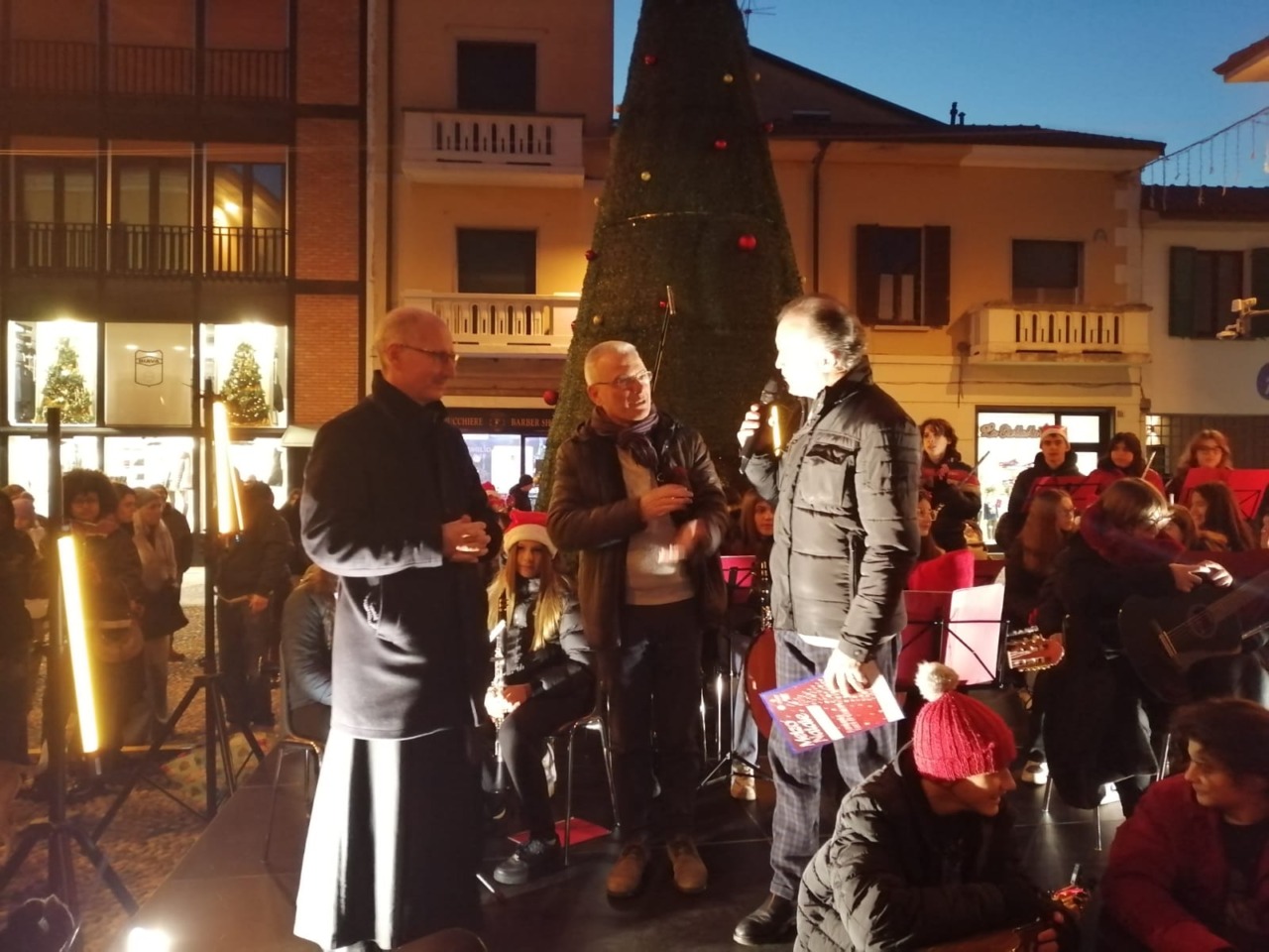 Ringrazio il sindaco per questo invito e ringrazio voi ragazzi perché avete suonato benissimo e ci avete introdotto nel clima natalizio. Ringrazio voi che siete qui presenti e penso che la bellezza di questa accensione di luci che sono una vicina all’altra ci porti a richiamare un messaggio di fraternità per cui ciascuno può essere luce per il fratello e la sorella che ha accanto e per ogni persona che incontra. E questo è veramente bello perché solo così possiamo costruire la pace, la giustizia e la solidarietà che ci devono caratterizzare innanzitutto come uomini e come donne e poi, per chi crede, riconoscendosi figlio di Dio