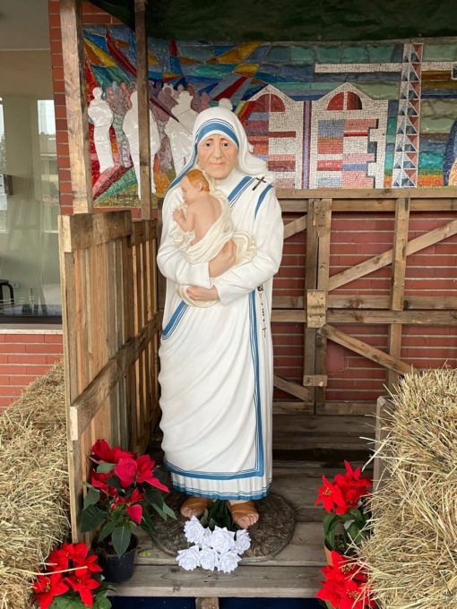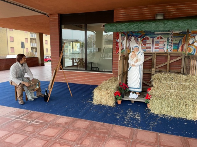 Una Natività speciale: senza bue e asinello, senza Maria e Giuseppe. Gesù Bambino è tra le braccia di Madre Teresa di Calcutta, da sola sotto la capanna. Poco lontano un pittore con tela e tavolozza osserva la scena.