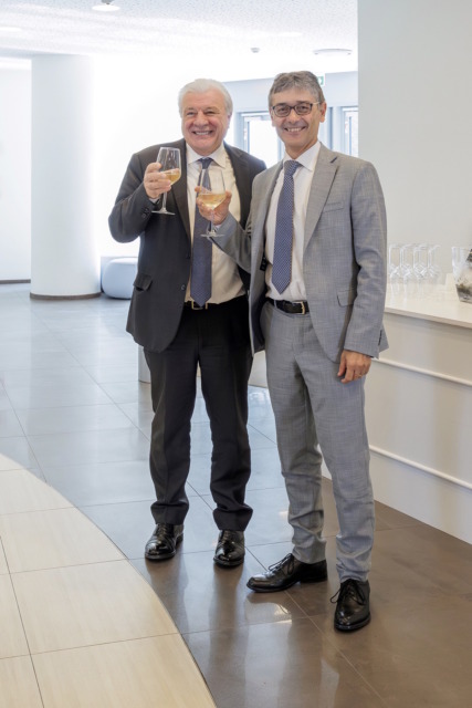 Nelle foto, la firma dell’accordo davanti al notaio (in alto) e il brindisi tra il presidente Bcc Giuseppe Maino (a sinistra) e quello della Casa dell’anziano San Camillo Emiliano Perego