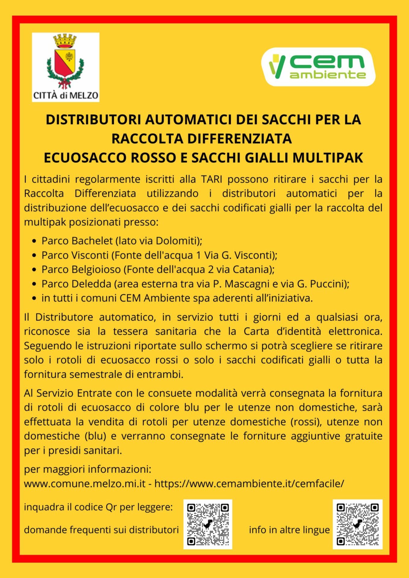 In tanti si stavano chiedendo come ma i non fosse ancora nota la data per il ritiro dei sacchi in Comune. La risposta sta nei nuovi distributori automatici che sono stati posizionati presso i parchi Bachelet, Visconti, Belgioioso e Deledda. Si tratta di sistemi di distribuzione automatiche dei rotoli con i sacchi per la differenziata, sia Ecuosacco che Multipack. Un sistema che è già stato introdotto dall’azienda partecipata in diversi Comuni soci e che sbarca anche a Melzo.
