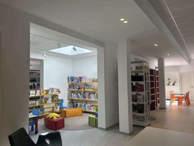 La progettazione degli spazi, affidata allo Studio Architettura 3Ve, include una reception, un primo salone open space collegato all’ingresso con tavoli da consultazione, espositivi e scaffalature, un secondo salone open space per la collocazione della maggior parte del patrimonio cartaceo della biblioteca e nicchie per i tavoli studio. A questi si aggiungono una sala lettura, due bagni, uno per adulti e uno per l’infanzia, oltre a uno spazio esterno pavimentato di circa 160 metri quadrati.
