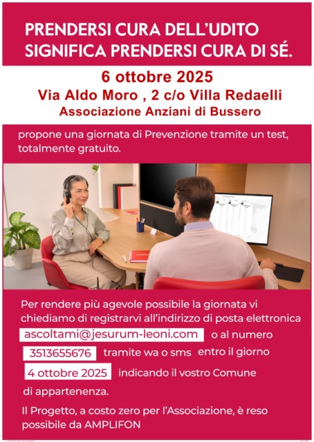 Amplifon, gruppo leader globale nei servizi e soluzioni per l’udito, partecipa all’iniziativa di Jesurum Leoni Comunicazione, con il coinvolgimento dell’ Associazione Anziani Bussero, per la sensibilizzazione alla cura uditiva, offrendo controlli dell’udito gratuiti alla popolazione. L’iniziativa risponde all’appello dell’Organizzazione Mondiale della Sanità (Oms) che, dopo i 50 anni, raccomanda test professionali dell’udito almeno una volta l’anno.
