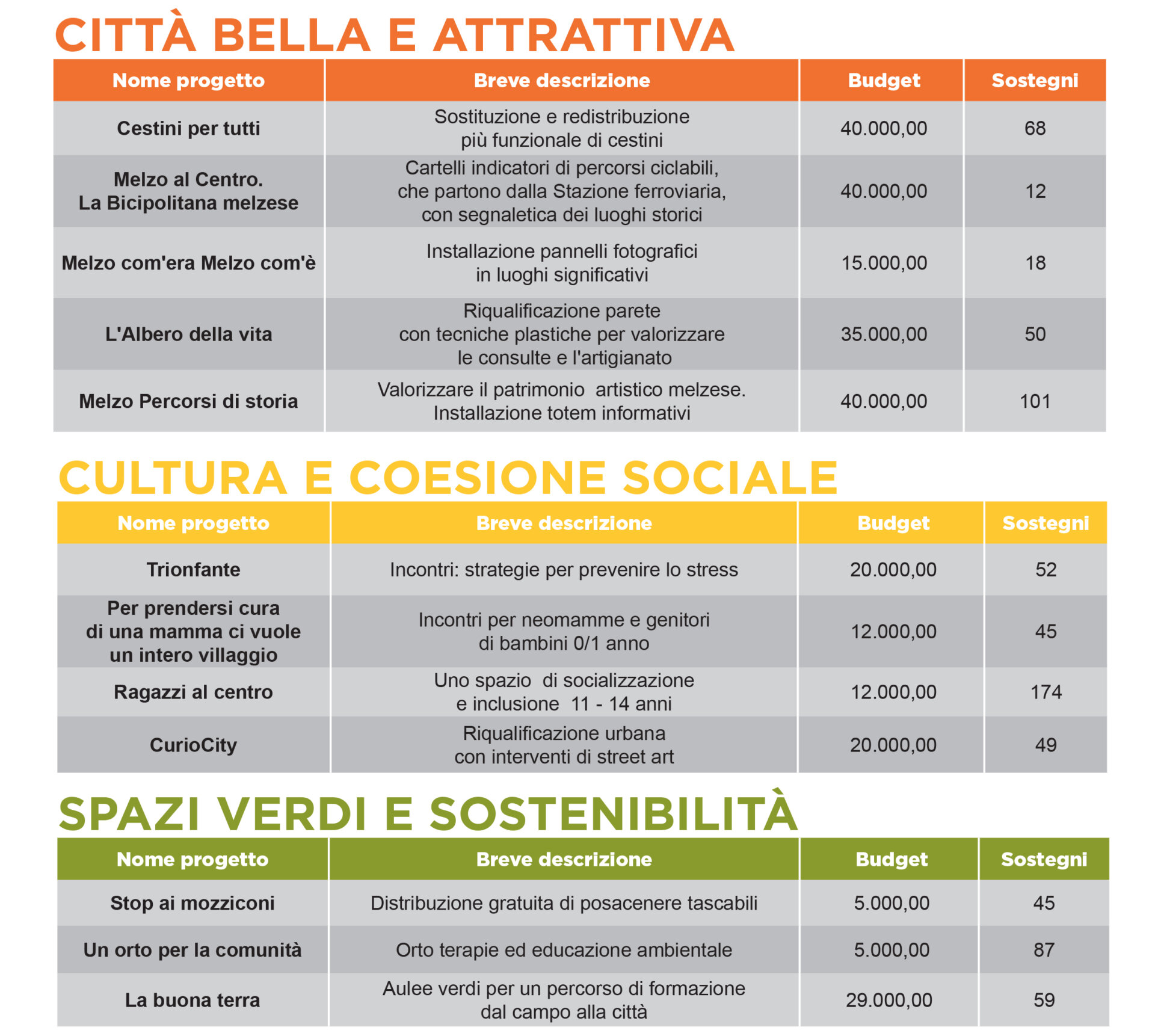 Nella categoria Città bella e attrattiva si può scegliere tra “Cestini per tutti”, con la loro sostituzione e redistribuzione per renderli più funzionali; “Melzo al centro. La bicipolitana melzese”, con cartelli indicatori dei percorsi ciclabili e segnaletiche dei luoghi storici; “Melzo com’era Melzo com’è”, con l’installazione di pannelli fotografici in luoghi significativi; “L’albero della vita”, con la riqualificazione di alcune pareti per valorizzare le Consulte e l’artigianato; “Melzo percorsi di storia”, per valorizzare il patrimonio artistico e storico tramite l’installazione di totem informativi.