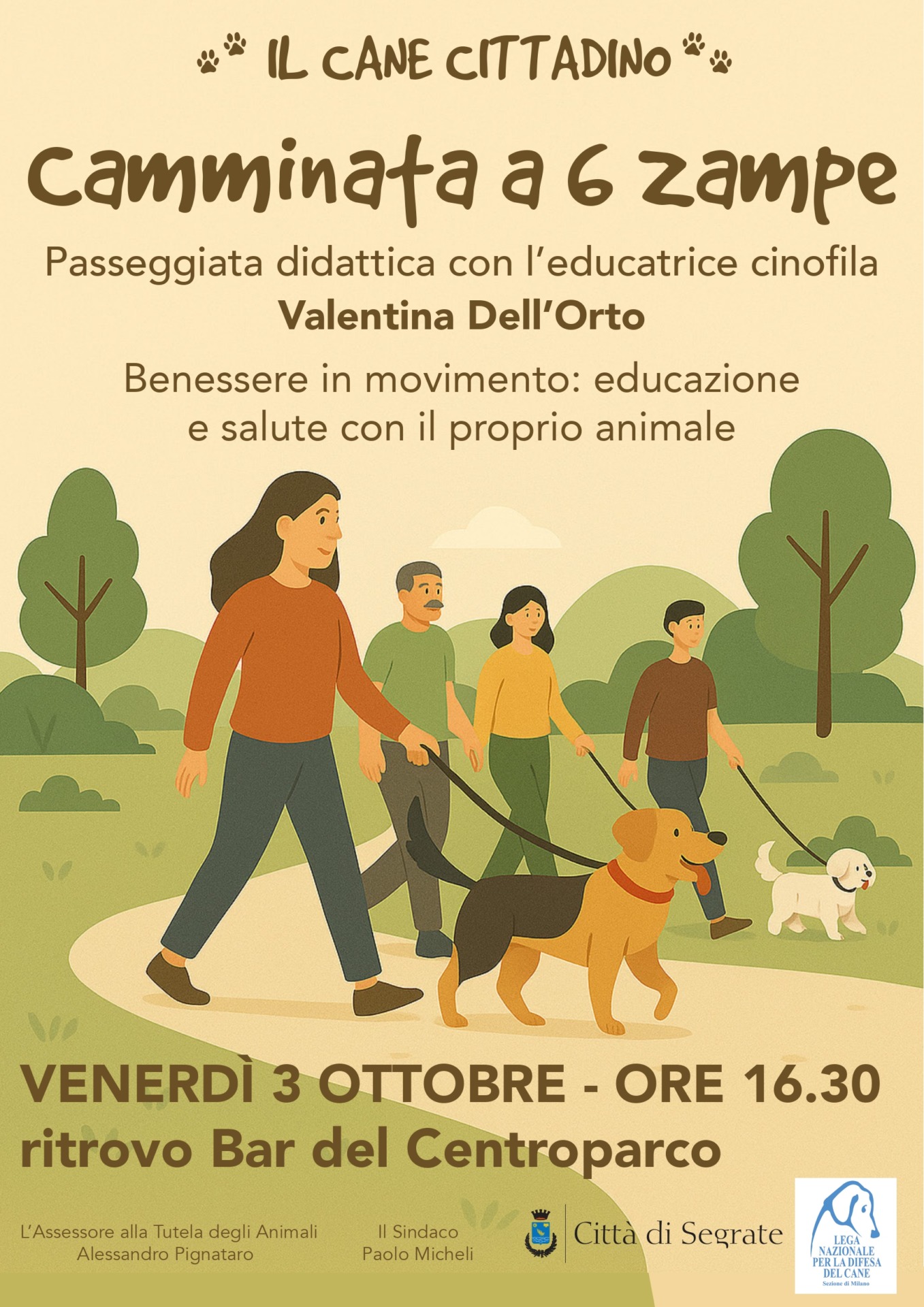 La “Camminata a 6 zampe” è una passeggiata didattica al Centroparco pensata per cani e padroni nell’ambito del progetto “Il Cane Cittadino”, per la cura e la tutela degli amici a quattro zampe. L’iniziativa è organizzata dal Comune di Segrate e dalla Lega Nazionale per la Difesa del Cane Sezione di Milano.