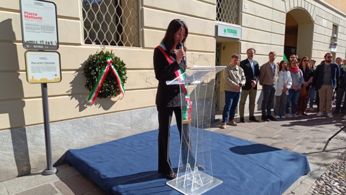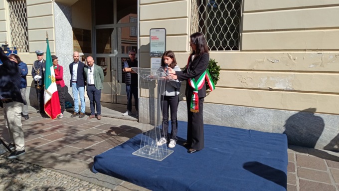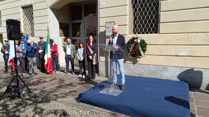 Qui si sono tenuti i discorsi istituzionali della vicesindaca, della presidente del Consiglio comunale dei ragazzi e delle ragazze e del presidente dell’Anpi, Simone Dossi.