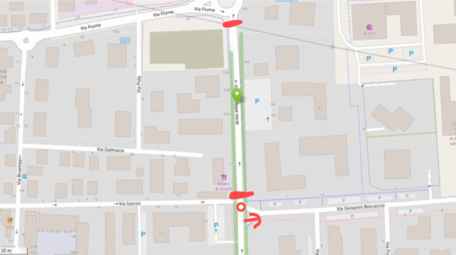 Obbligo di svolta a destra sulla via Isonzo all’intersezione con via Verdi.