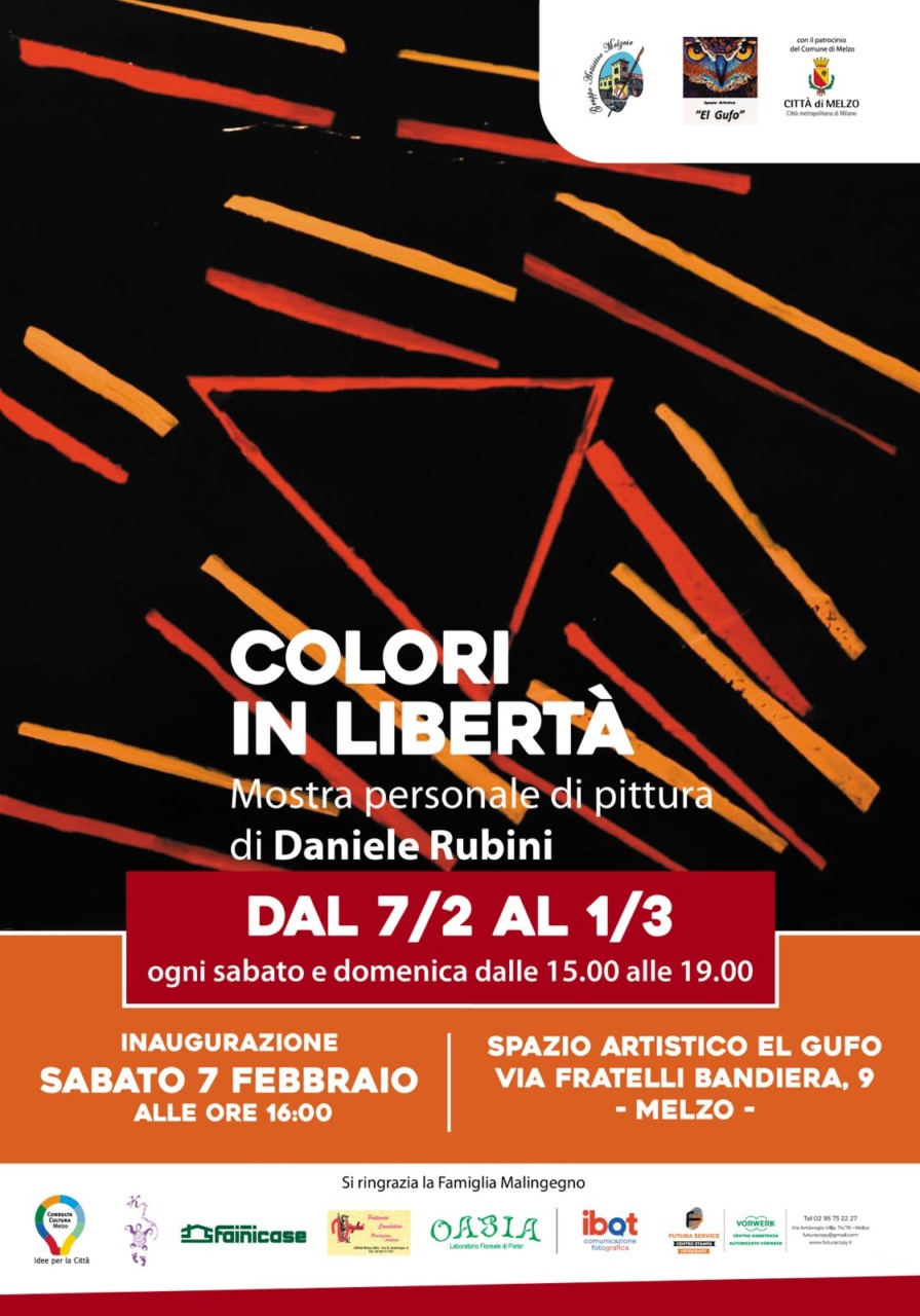 Sabato 7 febbraio 2026 è stata inaugurata a Melzo la nuova mostra personale di Daniele Rubini intitolata “Colori in libertà”. La collezione è esposta allo spazio artistico El Gufo (gestito dal Gam) e raccoglie una serie di opere astratte in cui il colore è il vero protagonista.