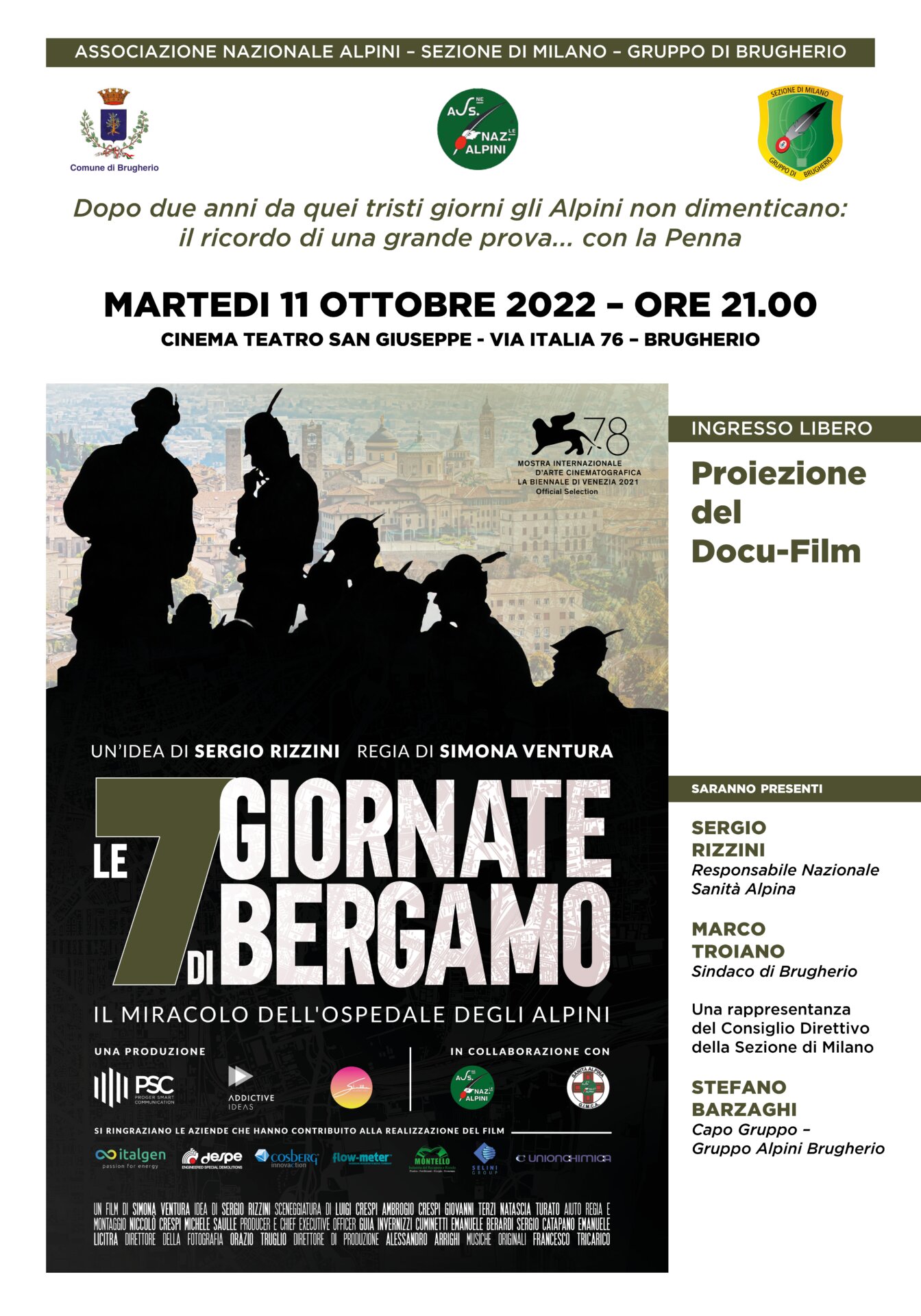 Il Gruppo Alpini nel contesto della festa patronale ha organizzato martedì 11 ottobre 2022 alle 21 presso il Cinema San Giuseppe di via Italia 76 la proiezione del “Docu-Film- Le 7giornate di Bergamo” il miracolo dell’ospedale degli Alpini.