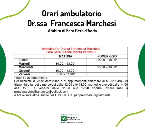 La dottoressa Marchesi riceverà presso l’ambulatorio di Fara Gera d’Adda, in Piazza Patrioti 3, secondo il seguente calendario settimanale: