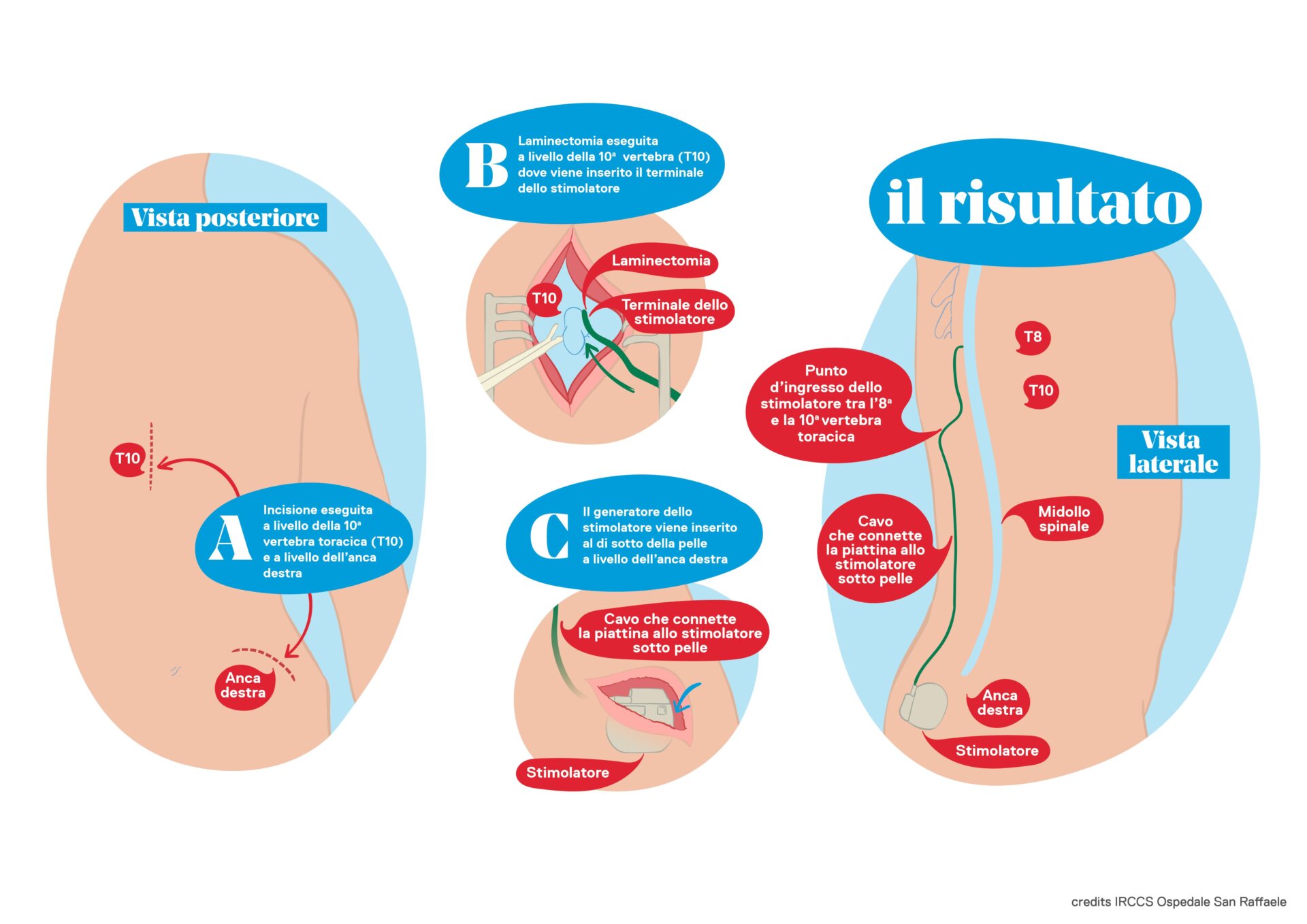 L’impianto del dispositivo è avvenuto in circa 3 ore, attraverso un delicato intervento neurochirurgico mininvasivo, eseguito in monitoraggio neurofisiologico continuo. Il pacemaker è stato poi programmato per garantire l’attivazione coordinata di tutti i muscoli necessari alla deambulazione. Il controllo delle funzioni dello stimolatore è possibile grazie a una serie di opzioni funzionali che possono essere scelte dalla paziente in base alle necessità locomotorie della vita quotidiana.