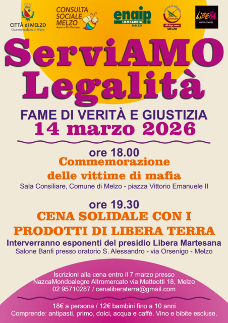 In occasione della giornata nazionale della Memoria e dell’Impegno in ricordo delle vittime innocenti delle mafie, l’Amministrazione comunale ha organizzato un momento commemorazione che si terrà sabato 14 marzo dalle 18 alle 19 presso la sala consiliare del Comune di Melzo. Verranno letti i nomi delle 50 vittime innocenti di sui sono state realizzate le sagome utilizzate per la camminata antimafia del 2025 e che le diverse associazioni melzesi hanno “adottato”. Saranno presenti i rappresentanti delle diverse istituzioni pubbliche, le associazioni del Terzo Settore e i rappresentanti del neonato presidio di Libera Martesana, da poco intitolato Giuseppe e Salvatore Asta.