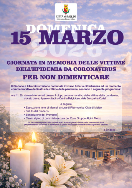 Il giorno successivo, domenica 15 marzo, ci si sposta nel parco Belgioioso di via Curiel per la commemorazione delle vittime del Coronavirus. Si comincia alle 11.30 con l’inno di Mameli, i discorsi istituzionali, la benedizione del monumento e in conclusione il canto del Coro Ana degli Alpini di Melzo.