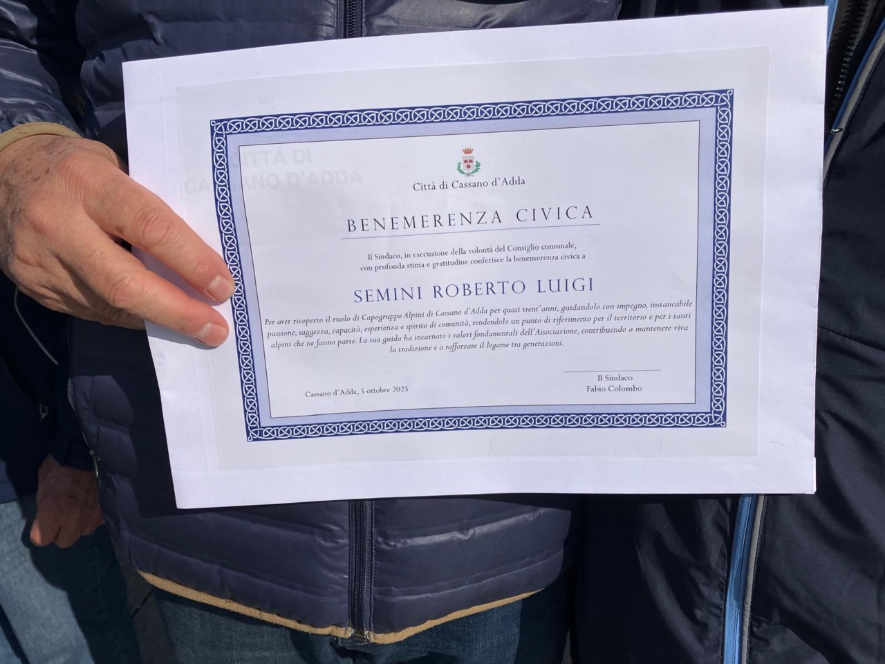 ha commentato Semini, che poi ha ringraziato il presidente del Consiglio comunale Giovanni Albano per averlo proposto per la benemerenza, le Amministrazioni comunali che si sono susseguite negli ultimi 30 anni, i cassanesi e gli Alpini del gruppo Ana che hanno lavorato con lui.