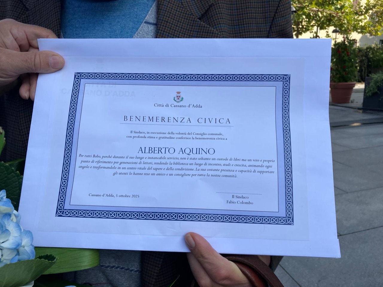 Sono state consegnate questa mattina, domenica 5 ottobre 2025, in occasione della festa patronale di Cassano, le benemerenze civiche. A ricevere il riconoscimento dalla mani del sindaco Fabio Colombo sono stati l’ex capogruppo degli Alpini Roberto Semini, il bibliotecario Alberto Aquino, per tutti Bobo, la volontaria Adriana Guidetti e il Cav.