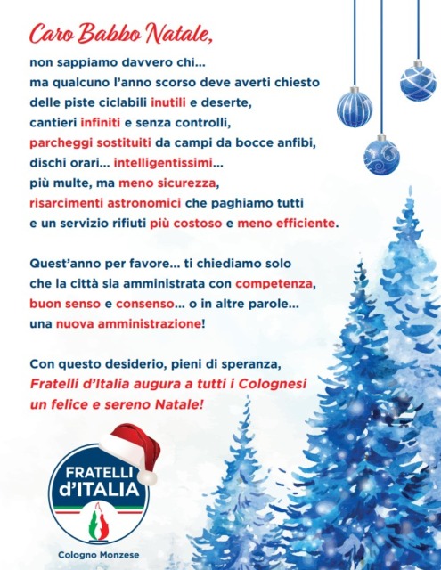 “Caro Babbo Natale, non sappiamo davvero chi… Ma qualcuno l’anno scorso deve averti chiesto delle piste ciclabili inutili e deserte, cantieri infiniti e senza controlli, parcheggi sostituiti da campi da bocce anfibi, dischi orari… intelligentissimi… Più multe, ma meno sicurezza, risarcimenti astronomici che paghiamo tutti e un servizio rifiuti più costoso e meno efficiente – si legge nel manifesto apparso in questi giorni a Cologno, proprio a ridosso del Natale – Quest’anno per favore… ti chiediamo solo che la città sia amministrata con competenza, buon senso e consenso… O in altre parole… una nuova Amministrazione! Con questo desiderio, pieni di speranza, Fratelli d’Italia augura a tutti i colognesi un felice e sereno Natale!”.