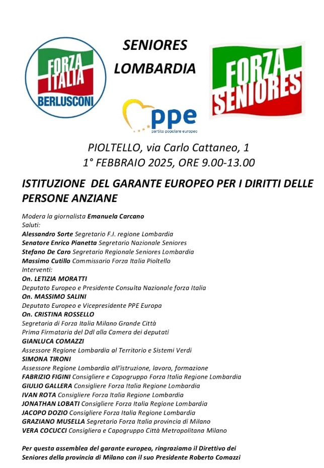 A organizzare l’evento i Seniores, guidati dal segretario regionale Stefano De Caro, promotori della proposta di legge per istituire il garante europeo per i diritti delle persone anziane. Appuntamento sabato 1 febbraio dalle 9 alle 13. In veste di relatori, dopo i saluti del segretario regionale Alessandro Sorte e di quello pioltellese Massimo Cutillo, i deputati europei Letizia Moratti e Massimo Salini, insieme agli assessori regionali Gianluca Comazzi e Simona Tironi, ai consiglieri lombardi e ai rappresentanti di FI in Città metropolitana. L’ingresso è libero, accesso da via Carlo Cattaneo 1.
