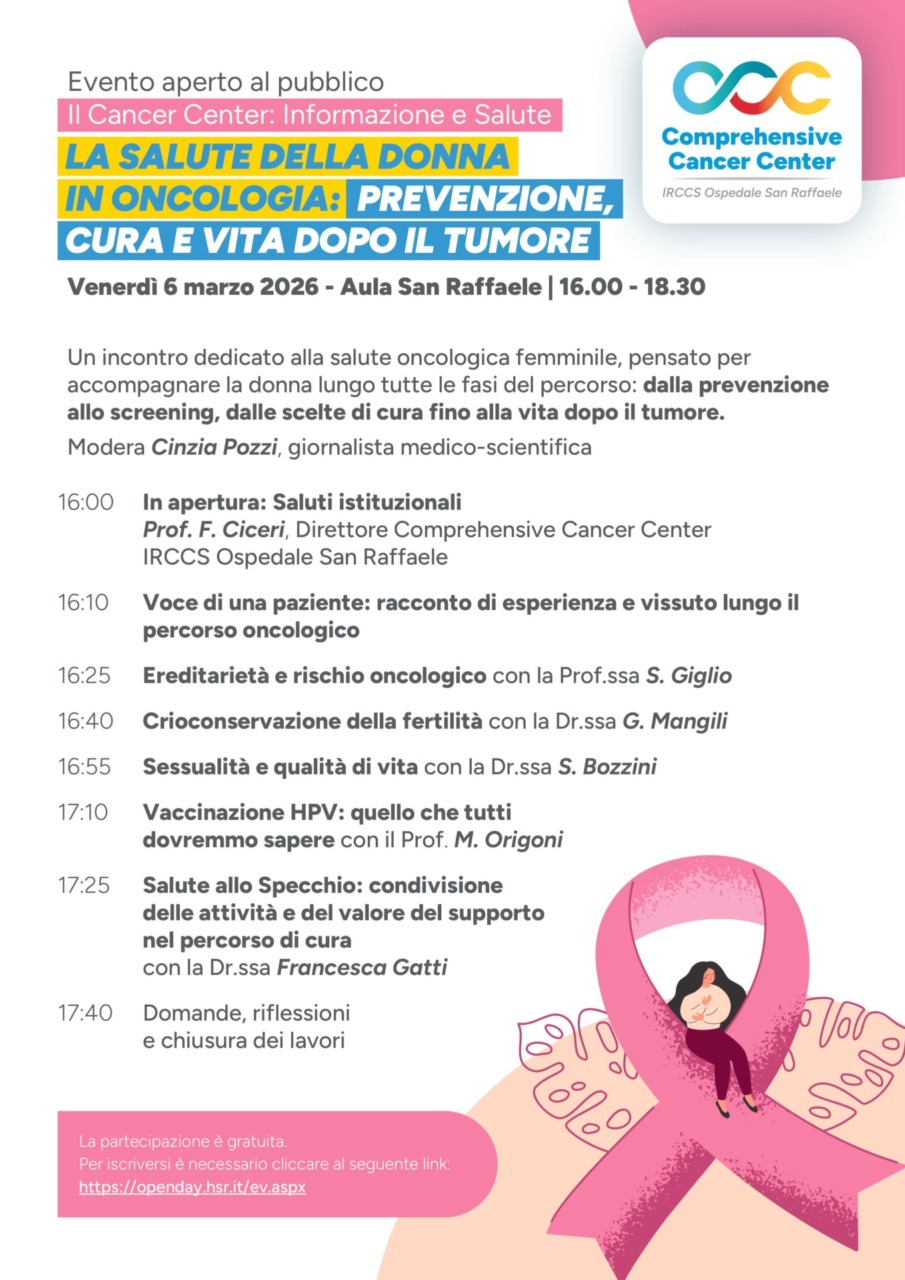 Il primo evento, venerdì 6 marzo 2026 alle 16, con l’Open Day del Comprehensive Cancer Center dal titolo: “La salute della donna in oncologia: prevenzione, cura e vita dopo il tumore”.Un incontro rivolto a pazienti, familiari e cittadinanza per affrontare i principali temi della salute oncologica femminile lungo tutto il percorso di malattia: dalla prevenzione alla fertilità, dalla sessualità all’ereditarietà dei tumori, fino alla qualità di vita dopo le cure.