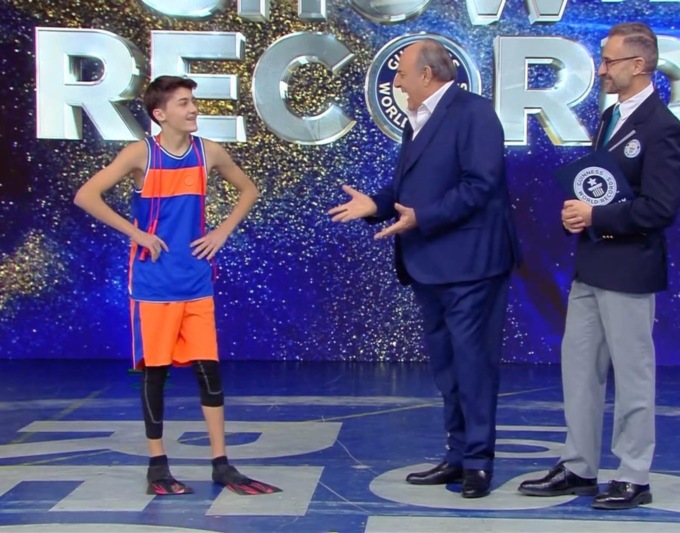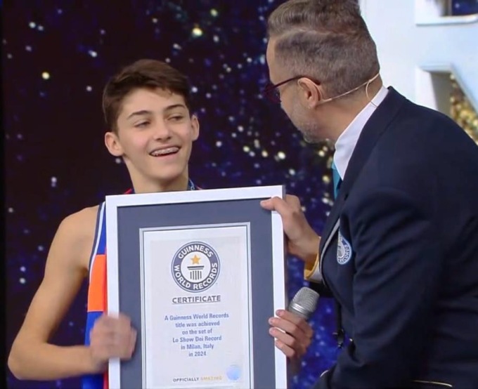 Originario di Pioltello, ma iscritto alla scuola di Rodano, qui si allena nella palestra del padre. Questa volta, però, il primato lo ha infranto da solo. Tra l’altro in un record alquanto insolito, il salto alla corda all’indietro su una gamba sola con le pinne. In 30 secondi, il risultato da battere era di 70 salti, ma ha superato se stesso ottenendo 110 conteggi.