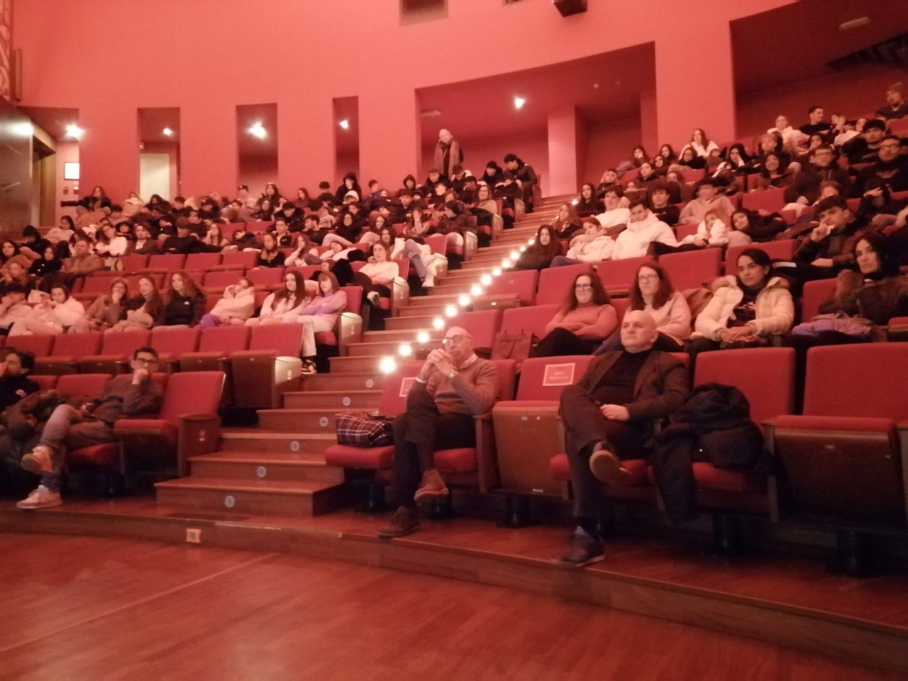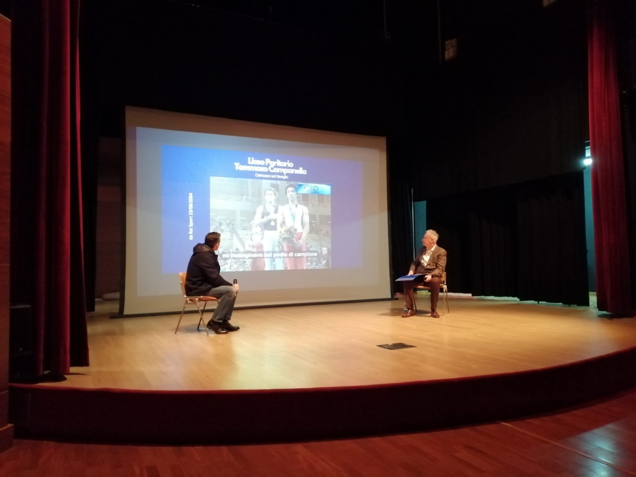 Dopo i saluti di rito Claudio Gallo, docente dell’istituto, ha introdotto l’ospite della giornata, elencando il suo ricco palmarès che culmina con il trionfo olimpico di Atene, e ha condotto l’intervista grazie alla quale Igor Cassina si è raccontato ai giovanissimi studenti che riempivano l’auditorium.