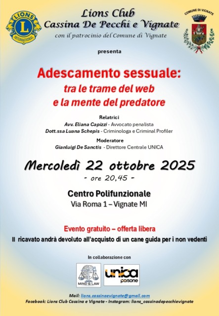 Il Lions Club Cassina de’ Pecchi e Vignate , con il patrocinio del Comune di Vignate e in collaborazione con Mind&Law e Unica Persone, ha organizzato un evento informativo dedicato al tema dell’adescamento online, alle strategie dei predatori e ai pericoli presenti nella rete.