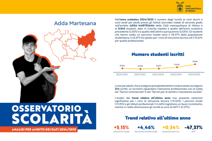 Se si analizzano i dati aggregati delle zone omogenee, escludendo Milano, si rileva che nell’ultimo quinquennio il numero degli studenti è cresciuto del 2,2%. Nell’ultimo quinquennio si registra un incremento della popolazione scolastica in alcune zone omogenee e in particolare negli ambiti: NORD MILANO (5,95%), ADDA MARTESANA (3,63%) e NORD OVEST (2,45%). Per quanto riguarda i percorsi di studio, il 48,50% degli studenti frequenta un corso liceale, il 36,97% ha scelto un indirizzo tecnico, mentre il 13,02% ha optato per l’istruzione professionale (1,51% corsi IeFp).