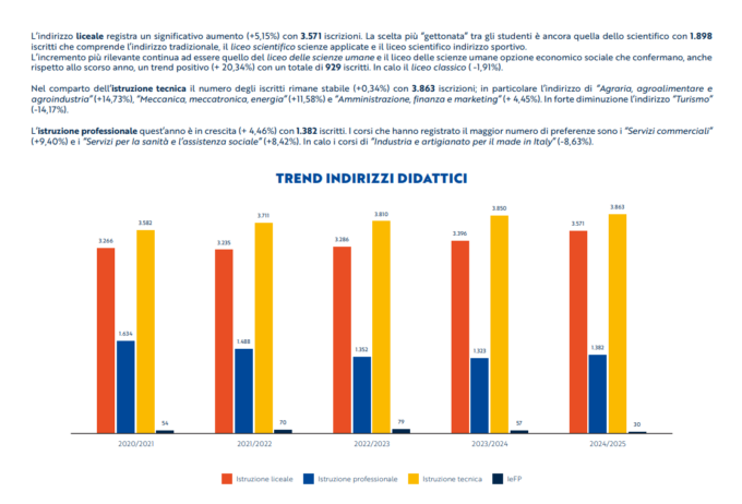 L’istruzione professionale registra quest’anno la maggiore crescita (+7,4%). In netta ripresa il corso di “Servizi per l’enogastronomia e ospitalità alberghiera” che, dallo scorso anno, ha visto una crescita del + 31,9% dopo anni di costante calo. Il percorso didattico con più iscritti 4.468 è “Servizi per la sanità e l’assistenza sociale” con un incremento del +13,3%. Tra i corsi che hanno visto, nel quinquennio, un calo di iscrizioni “Arti ausiliarie delle professioni sanitarie – odontotecnico” (-25,1%) e i “Servizi per l’agricoltura e lo sviluppo rurale” (-9,5%).