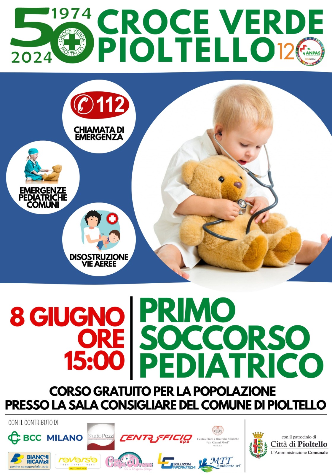 Appuntamento sabato 8 giugno 2024 con il corso gratuito di Primo soccorso pediatrico organizzato dalla Croce Verde di Pioltello con il patrocinio dell’Amministrazione e il sostegno di svariati sponsor. Obiettivo della lezione fornire gli strumenti a genitori, nonni ed educatori per conoscere le emergenze primarie quando ci si relaziona con i bambini e sapere come comportarsi.