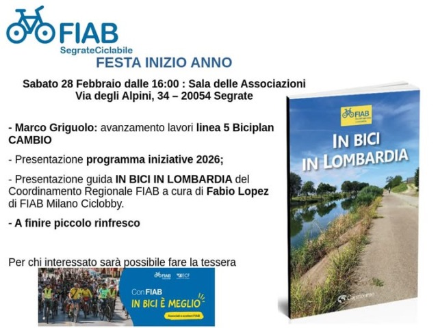 Sabato 28 febbraio 2026 alle 16, al primo piano della sala delle Associazioni in via degli Alpini 34 a Segrate, si terrà la prima delle feste annuali della Fiab, l’associazione cittadina presente sul territorio dal 2004. Al centro del pomeriggio ci saranno le attività e le iniziative pensate per il nuovo anno e i futuri progetti che il gruppo promuoverà attivamente sul territorio.