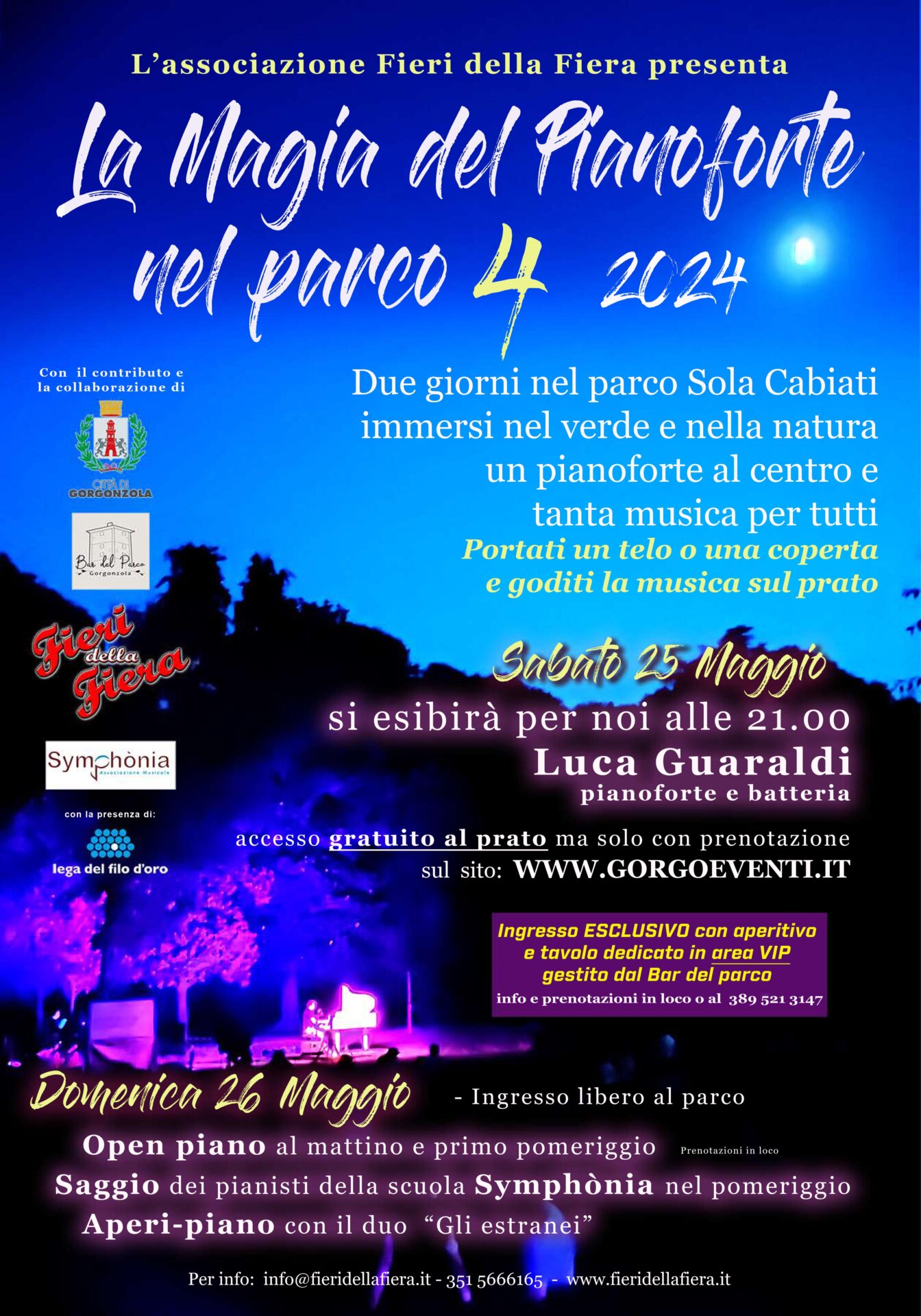 Appuntamento con la musica, con la natura e con la solidarietà. Torna per la sua quarta edizione l’iniziativa “La magia del pianoforte nel parco”, l’evento organizzato a Gorgonzola da Fieri della Fiera, dall’associazione Symphònia e dal Bar del Parco, con il patrocinio del Comune. Appuntamento sabato 25 maggio e domenica 26 maggio al Parco Sola Cabiati.