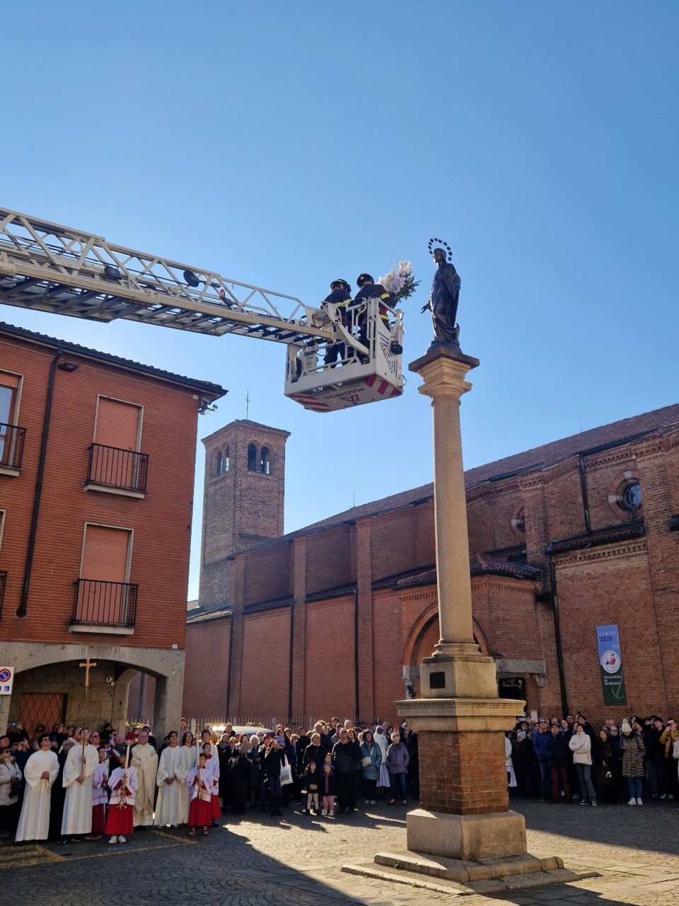Una tradizione che ogni anno rivive nella festa dell’Immacolata a Melzo. I Vigili del fuoco di Gorgonzola hanno deposto un mazzo di fiori bianchi ai piedi della statua, a una dozzina di metri di altezza.