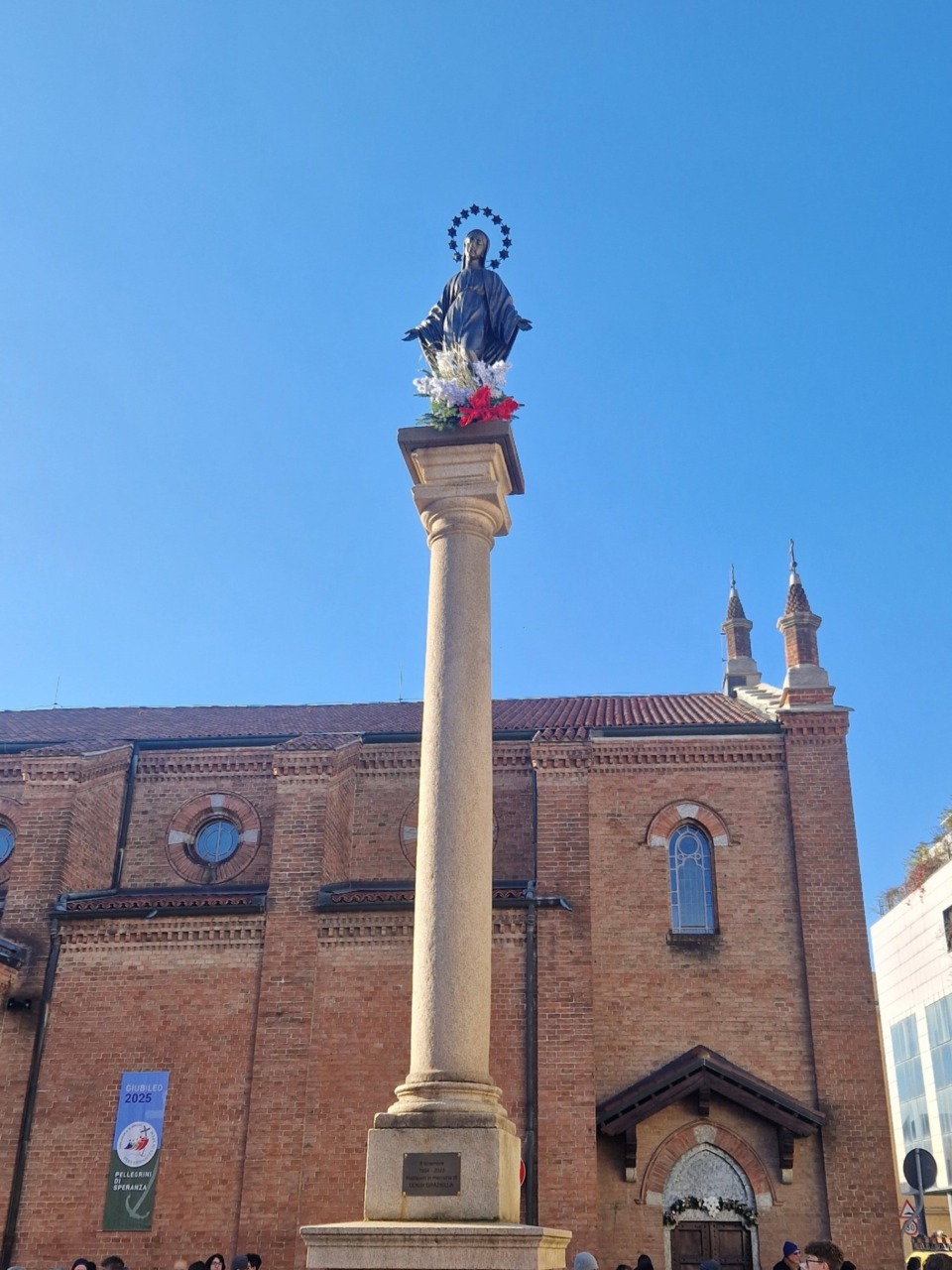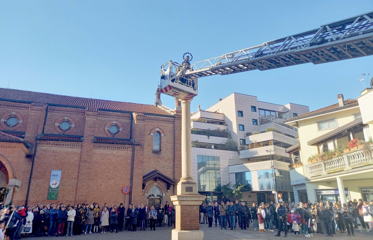 Oggi, lunedì 8 dicembre 2025, i cittadini di Melzo hanno assistito a una tradizione che ormai dura da tempo e che collega la comunità pastorale San Francesco con la vicina caserma dei Vigili del fuoco di Gorgonzola. Come ogni anno, infatti, i pompieri hanno preso parte alla Messa, officiata per la prima volta dal prevosto don Renato Fantoni, con i mezzi parcheggiati al di fuori della chiesa. Perché al termine della funzione, di fronte a tanti cittadini – specialmente bambini emozionati di vedere all’opera i pompieri – sono saliti a bordo dell’autoscala per deporre un mazzo di fiori ai piedi della statua della Madonna posta sulla colonna sul sagrato esterno della chiesa dei Santi Alessandro e Margherita.