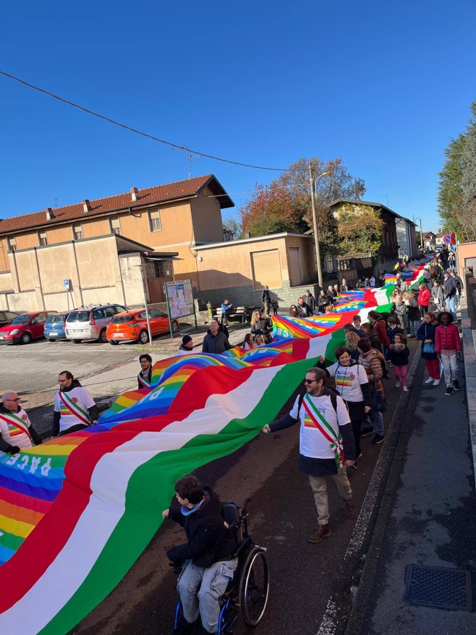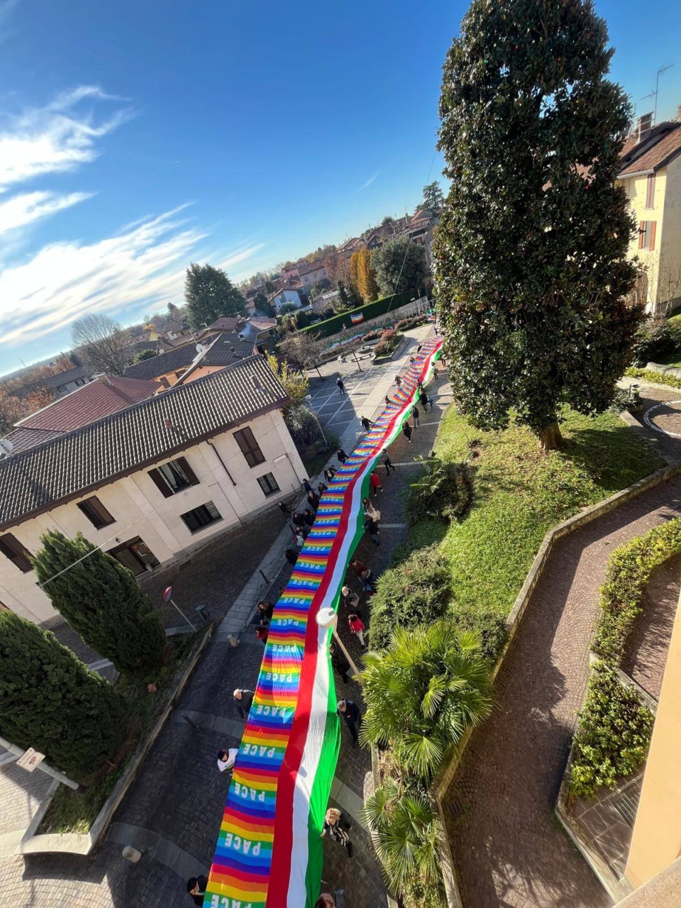 Una Marcia per la Pace lunga 9 mesi. E’ quella che sabato 22 novembre 2025, ha vissuto il suo ultimo atto a Masate dove, in piazza della Repubblica si sono trovati i delegati dei sette Comuni del trezzese che hanno dato vita all’iniziativa. Nel corso della mattinata è stato spiegata, ancora una volta, la gigantesca bandiera della pace lunga 150 metri che ha caratterizzato tutte le tappe dell’iniziativa. L’intervento della Croce Rossa Italiana e dei sindaci dei comuni del trezzese che hanno aderito all’iniziativa, hanno caratterizzata la giornata e concluso l’evento in cui è stato rivendicato il diritto alla pace per tutti i popoli. La Marcia per la Pace ha registrato la prima tappa a Vaprio il 6 aprile, con il testimone che è stato portato nella vicina Pozzo. La seconda tappa, l’11 maggio, partita da Pozzo è arrivata a Trezzo da dove il 7 giugno la Marcia è ripartita alla volta di Grezzago. Il 29 giugno la Marcia da Grezzago ha raggiunto Trezzano Rosa, per poi proseguire per Basiano il 21 settembre e infine raggiungere Masate da Basiano il 19 ottobre. Sabato l’ultimo evento svolto totalmente a Masate. Ogni tappa è stata caratterizzata oltre alla Marcia da un Comune all’altro da eventi e manifestazioni sul tema.