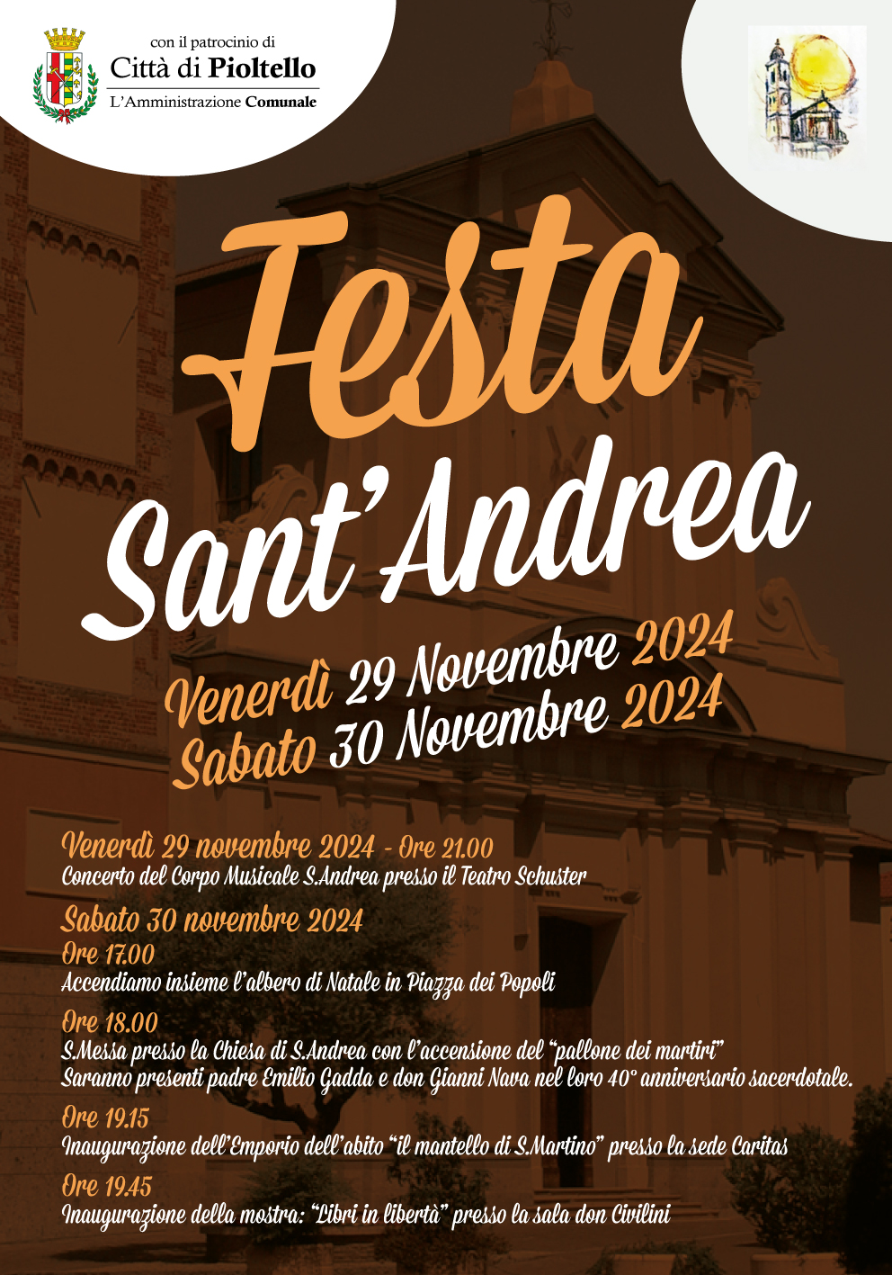In occasione della Festa patronale di Sant’Andrea, sabato 30 novembre alle 17, in Piazza dei Popoli si terrà la cerimonia dell’accensione dell’albero di Natale. A seguire, alle 18, Santa Messa alla chiesa di Sant’Andrea officiata dal parroco don Giacomo Roncari col tradizionale Rito del Faro. Con lui, saranno presenti padre Emilio Gadda e don Gianni Nava per festeggiare i 40 anni di sacerdozio. Quest’anno il concerto della banda cittadina “Corpo Musicale di S. Andrea” sarà anticipato a venerdì 29 novembre alle 21 presso il teatro Schuster in via Aldo Moro 3.