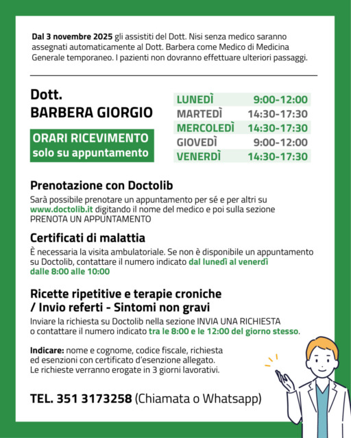 La buona notizia, arrivata a sorpresa è che il sostituto è stato individuato. Il dottor Barbera riceve solo su appuntamento nei seguenti orari: