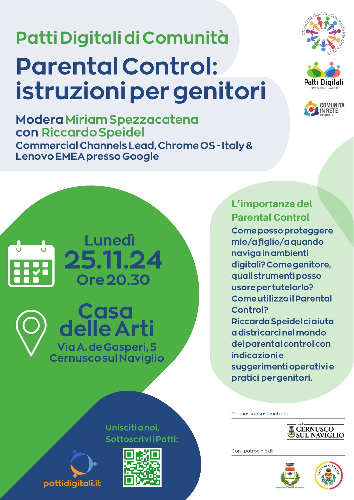 Per questo motivo i Comuni di Cernusco sul Naviglio, Cassina de’ Pecchi e Carugate non hanno esitato a sostenere e patrocinare l’iniziativa promossa dalle realtà Crescere digitali Cassina, Patti Digitali Cernusco e Comunità in rete Carugate. Appuntamento oggi, lunedì 25 novembre 2024, alle 20.30 presso la Casa delle Arti di via De Gasperi 5 a Cernusco sul Naviglio.