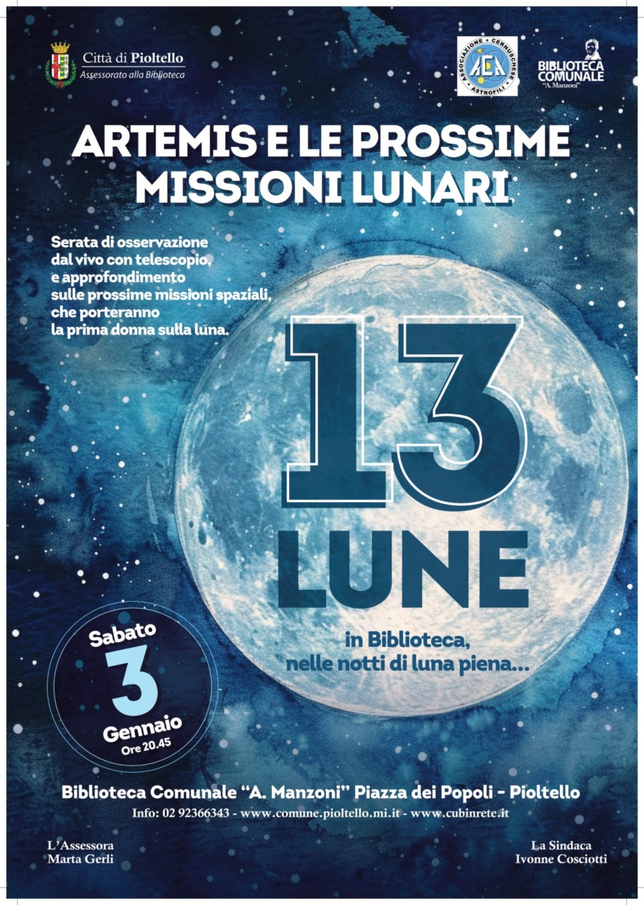Un progetto pensato per unire temi di vario genere con la passione per l’osservazione astronomica e non solo. A Pioltello è tutto pronto per il nuovo progetto promosso dall’Amministrazione comunale in collaborazione con la biblioteca “Manzoni” e intitolato “13 Lune”.
