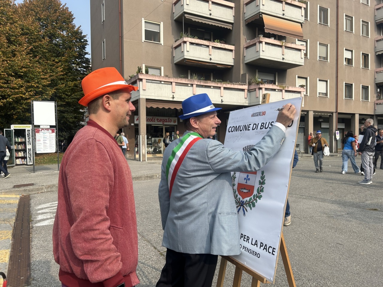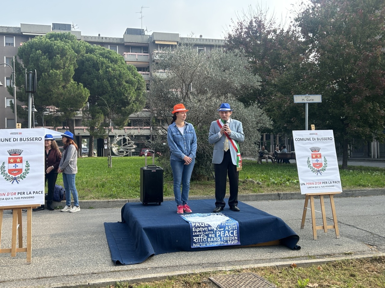 Un segno di speranza che parte anche dalla comunità, messo nero su bianco attraverso le tante firme raccolte in piazza Curie sui manifesti del “Perin d’or per la pace”.