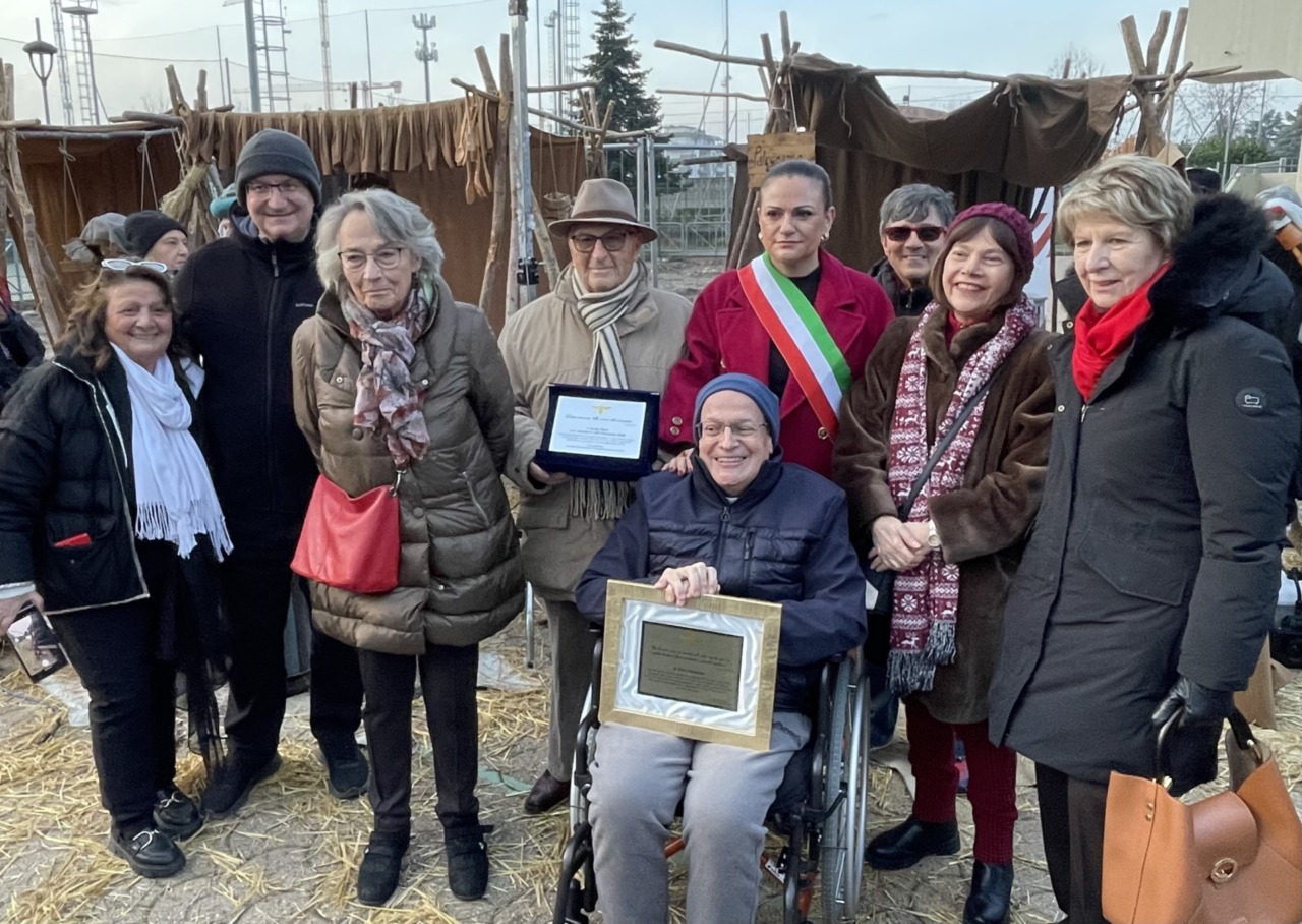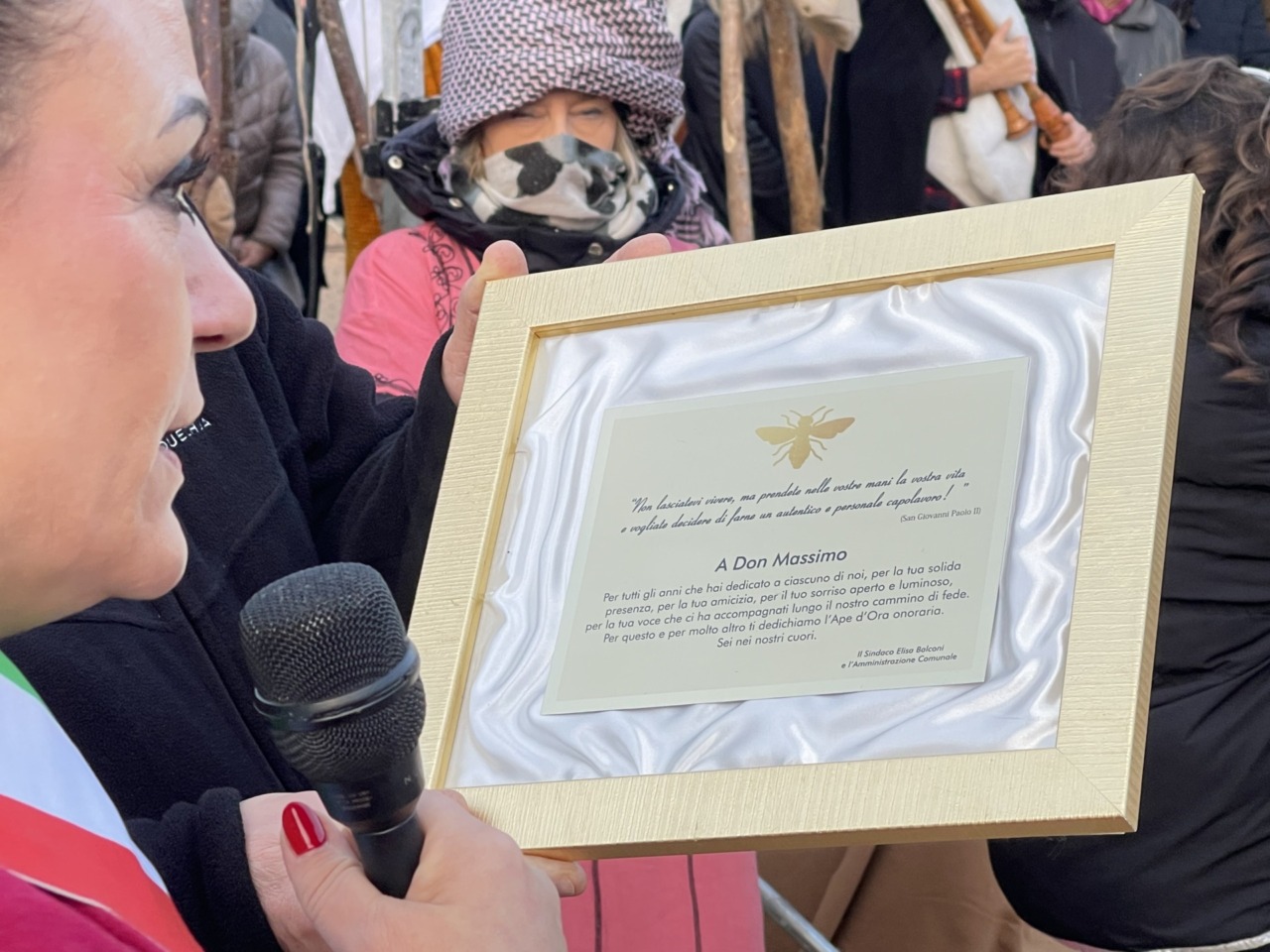Al termine della rappresentazione, spazio a un momento di grande commozione con la consegna da parte della sindaca Elisa Balconi della benemerenza onoraria dell’Apedora a don Massimo Donghi, ex parroco del paese per nove anni, che nei mesi scorsi ha annunciato ai fedeli di combattere contro un tumore. Visibilmente emozionato, il sacerdote ha ringraziato i presenti con parole sentite: