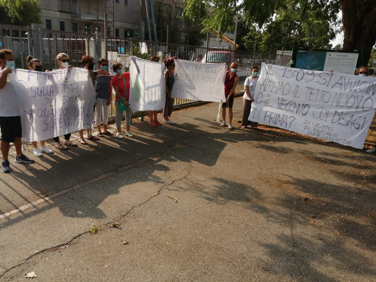 Oggi, sabato 24 luglio 2021 a Brugherio, davanti ai cancelli della Primaria Don Camagni, un gruppo di mamme e papà ha esposto gli striscioni per chiedere l’inizio dei lavori, mentre gli operai che devono riparare il tetto dalle infiltrazioni d’acqua casualmente hanno iniziato il cantiere proprio il giorno della protesta.