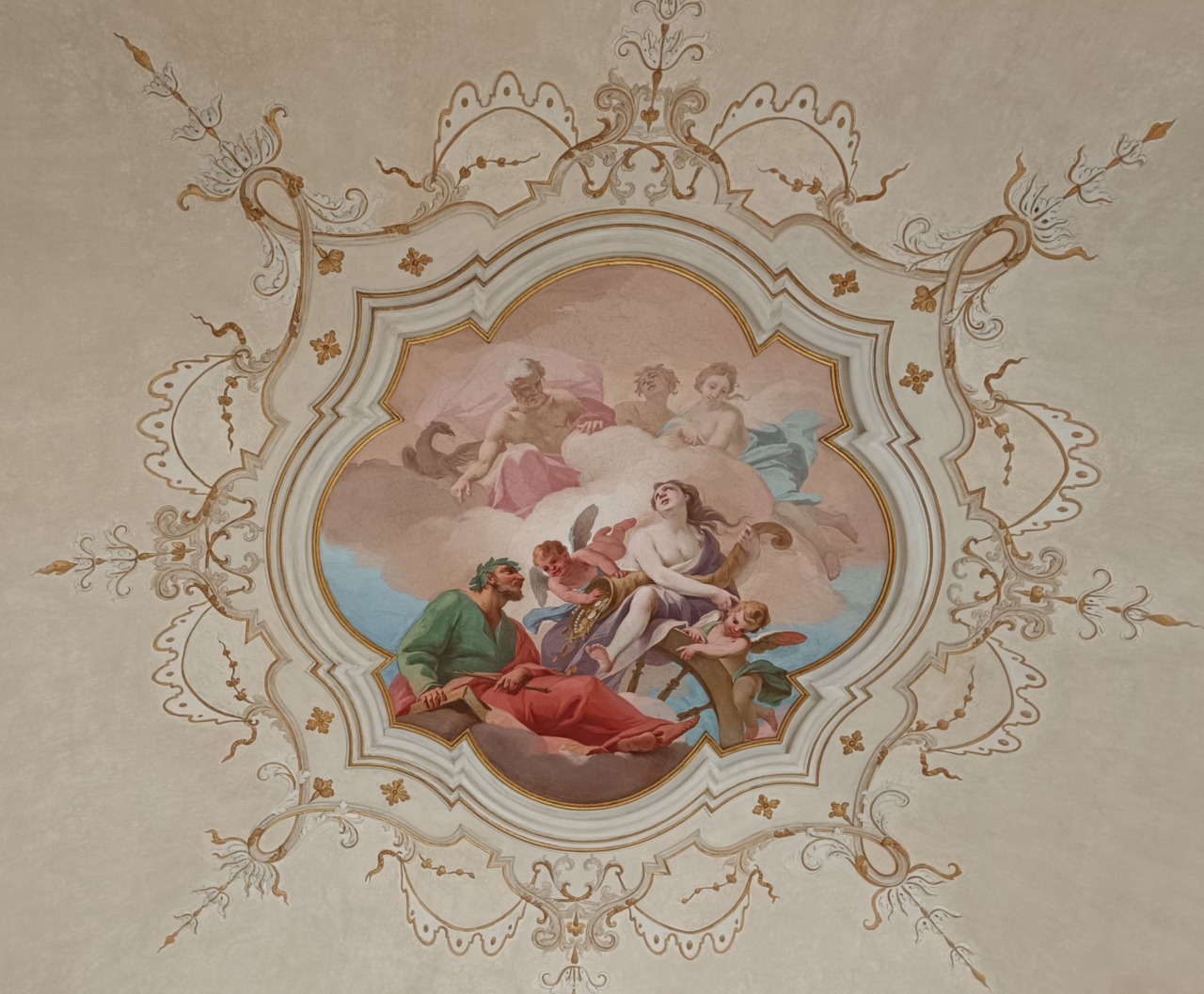 L’impresa che ha eseguito il restauro ha mantenuto tali decorazioni, perché sono anch’esse di un certo valore e se fossero state rimosse sarebbero state perdute. In questo modo si conservano sia queste, sia quelle originali settecentesche che rimangono sotto. Ne hanno lasciato intravedere alcune tracce nella parte superiore delle pareti.