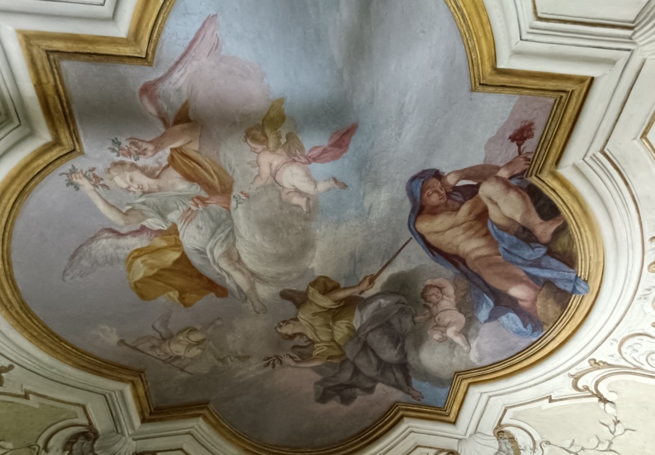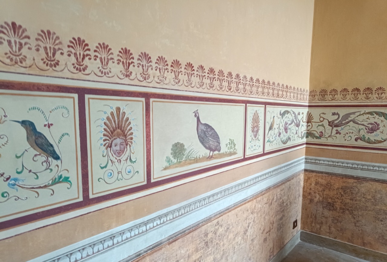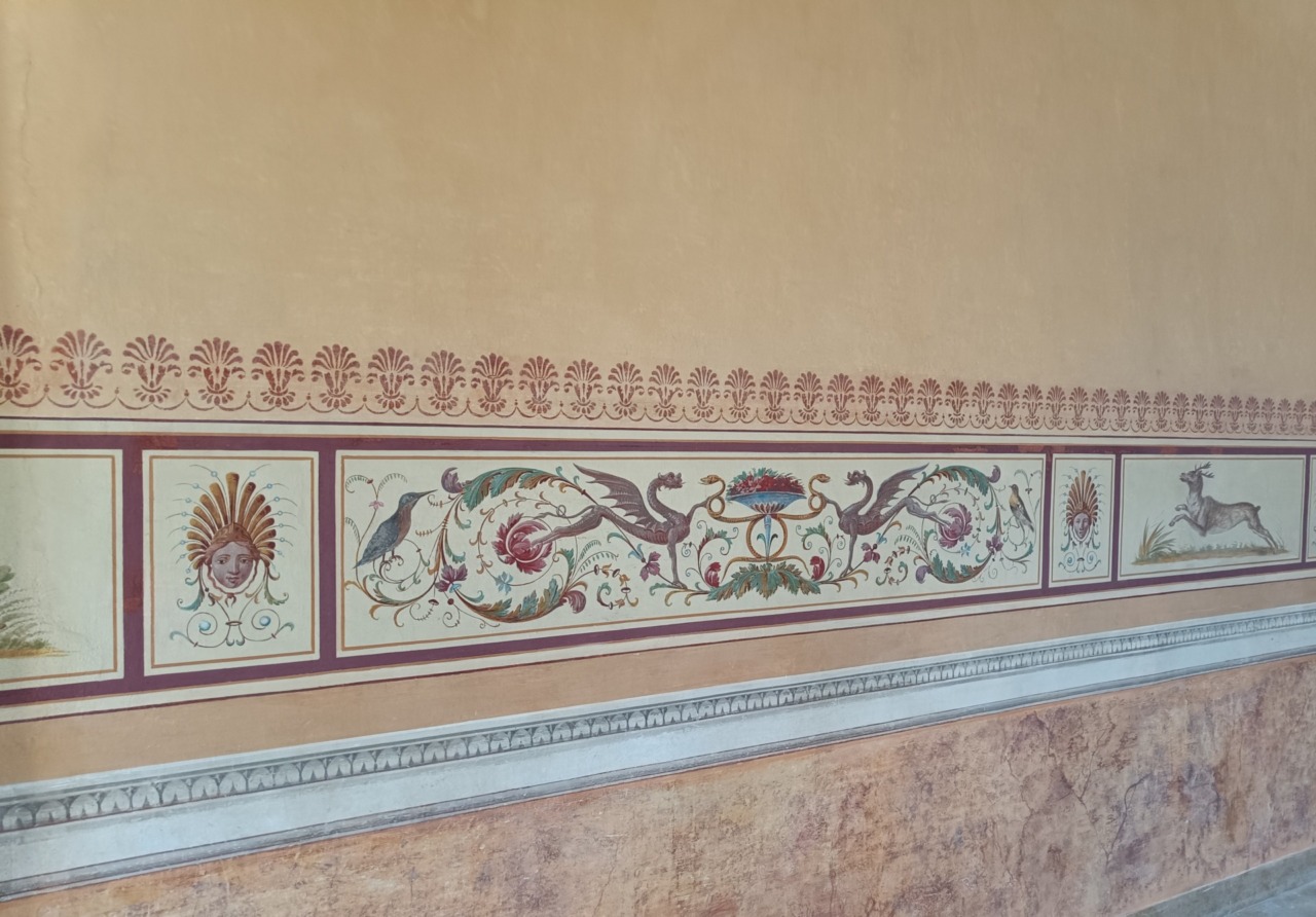 All’azzurrino originale (che si può ammirare nel salone con l’affresco del trionfo di Apollo) era stato sostituito un colore tra l’arancione e l’ocra con elementi decorativi caratterizzati da figure di animali ed elementi floreali a mezza altezza.