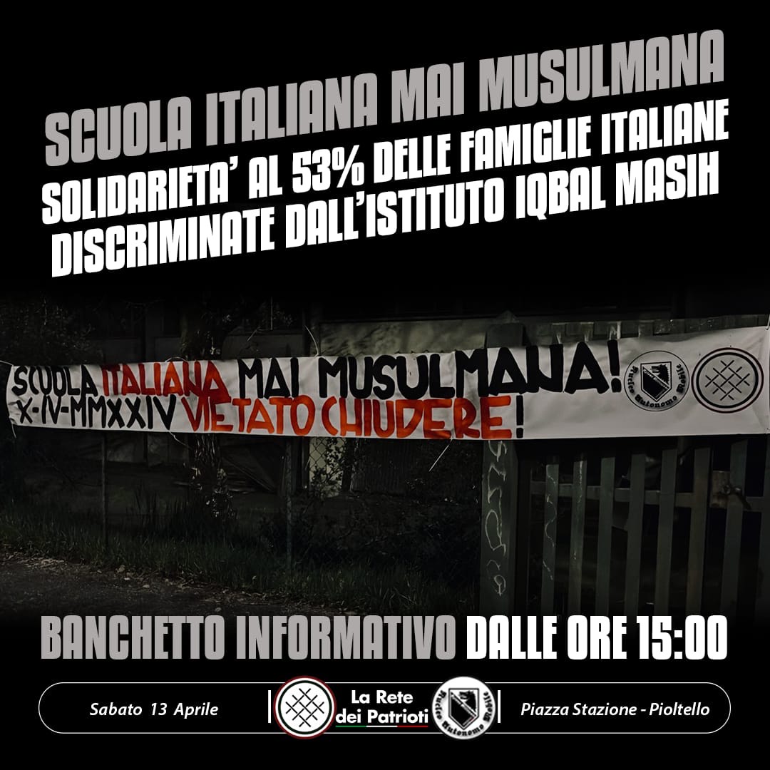 Dopo i due striscioni di protesta affissi fuori dalla scuola Iqbal Masih di Pioltello per contestare il preside Fanfoni, che ha istituito il 10 aprile, un giorno di festa, ultimo giorno del Ramadan, con la chiusura dell’istituto, il Nucleo Autonomo Mobile (NAM) – La Rete dei Patrioti (RdP) scendono in piazza con un gazebo di solidarietà al 53% di famiglie italiane. Infatti la decisione, che ha deliberato il Consiglio di istituto, ha creato grossi problemi organizzativi alla maggioranza delle famiglie italiane discriminate. Questo fatto gravissimo, oltre a legittimare il processo di islamizzazione in una scuola pubblica, ha visto il pieno appoggio della sinistra atea, che da sempre contrasta tutte le nostre festività cristiane. Manovra politica per racimolare voti, altrimenti non si spiegherebbe questa loro difesa religiosa. Noi invece ribadiamo la volontà di difendere la nostra identità culturale millenaria cristiana, se ne facciano una ragione. Segnaliamo inoltre il pericolosissimo effetto domino che ha visto in queste settimane altre scuole italiane aprirsi all’Islam con concessioni di aule, etc… Noi ci mettiamo la faccia e saremo in piazza sabato 13 aprile e aspettiamo tutti quegli italiani che vivono sulle loro spalle questa discriminazione al contrario.