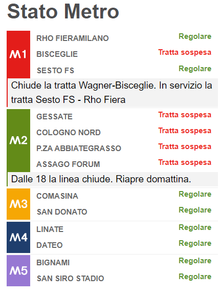 La notizia è stata diffusa pochi minuti fa dall’account ufficiale di Atm: dalle 18 chiude M2 (tutti i treni in viaggio arrivano al capolinea). Restano aperte M1, M3, M4 e M5. Alcune linee di superficie sono deviate e rallentate da una manifestazione.