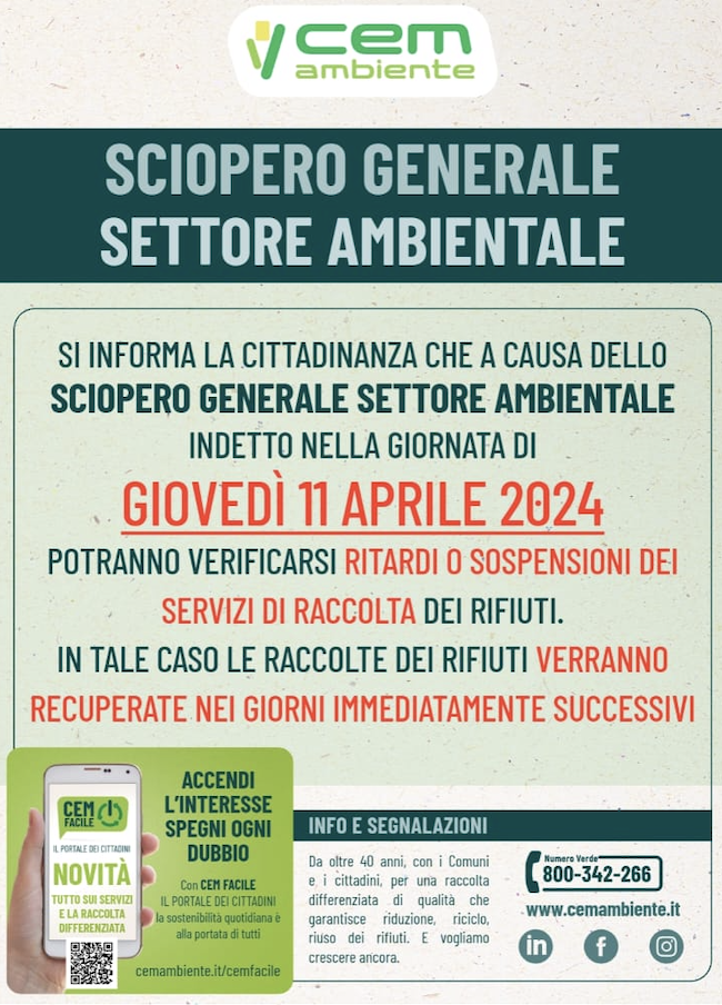 In seguito allo sciopero generale del settore proclamato dalle Organizzazioni sindacali per l’intera giornata di giovedì 11 aprile 2024, Cem Ambiente ha comunicato che potrebbero verificarsi interruzioni dei servizi svolti sul territorio. Per i casi di mancato ritiro verranno effettuati i recuperi nei giorni immediatamente successivi.