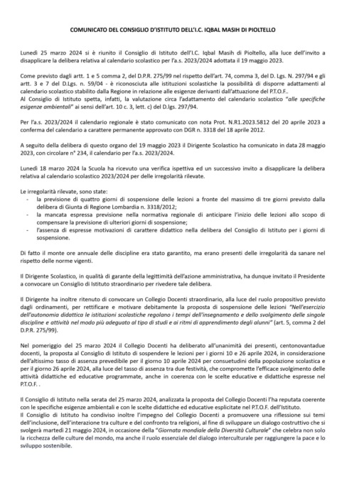 Dopo la comunicazione di ieri in cui si è confermata la chiusura del 10 aprile 2024, il Consiglio d’istituto dell’Iqbal Masih di Pioltello ha diramato un comunicato stampa ufficiale per spiegare le motivazioni dietro alla scelta e i cambiamenti del calendario scolastico a seguito delle indicazioni avute dai tecnici del ministero dell’Istruzione e dell’Ufficio scolastico regionale.