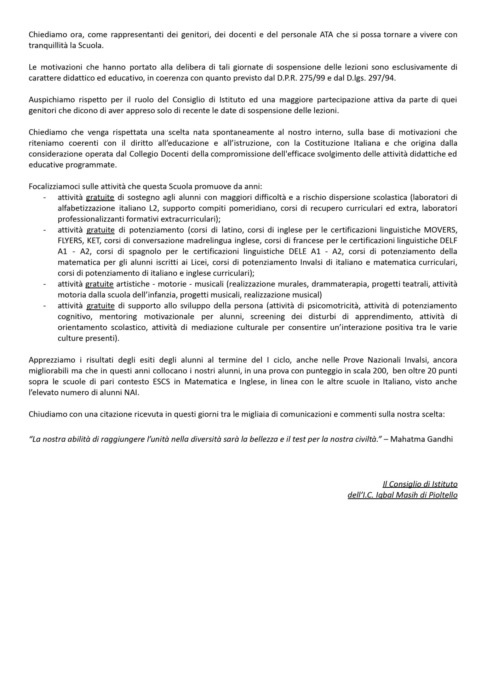 Chiediamo ora, come rappresentanti dei genitori, dei docenti e del personale Ata che si possa tornare a vivere con tranquillità la scuola. Le motivazioni che hanno portato alla delibera di tali giornate di sospensione delle lezioni sono esclusivamente di carattere didattico ed educativo, in coerenza con quanto previsto dal D.P.R. 275/99 e dal D.lgs. 297/94. Auspichiamo rispetto per il ruolo del Consiglio di istituto ed una maggiore partecipazione attiva da parte di quei genitori che dicono di aver appreso solo di recente le date di sospensione delle lezioni.