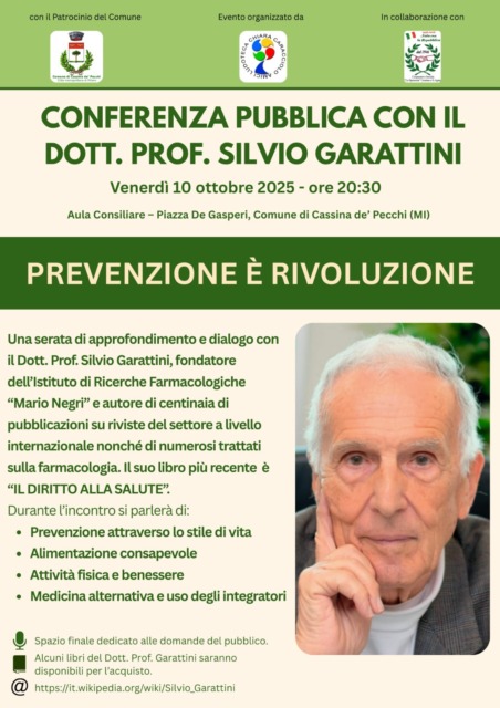 Importante evento dedicato ai temi della salute e della prevenzione a Cassina de’ Pecchi. Venerdì 10 ottobre 2025, alle 20.30, presso nell’aula consiliare di piazza De Gasperi, si terrà una conferenza pubblica con l’illustre medico Silvio Garattini, noto fondatore dell’Istituto “Mario Negri” e autore di numerose pubblicazioni scientifiche a livello internazionale.